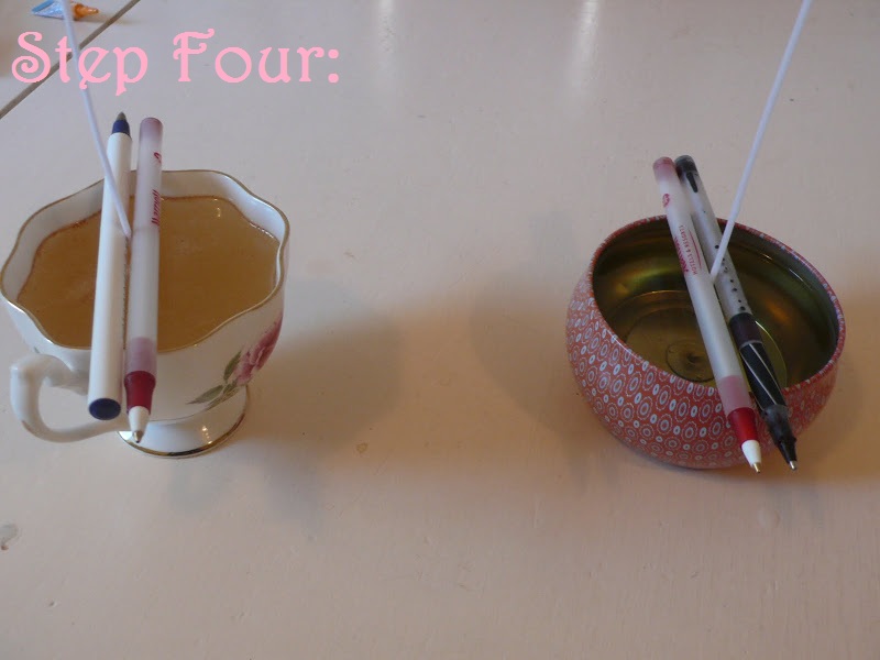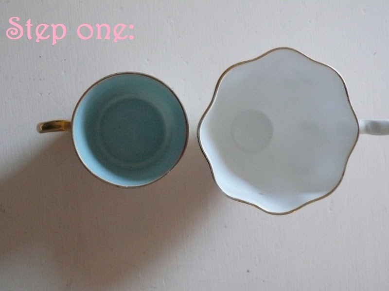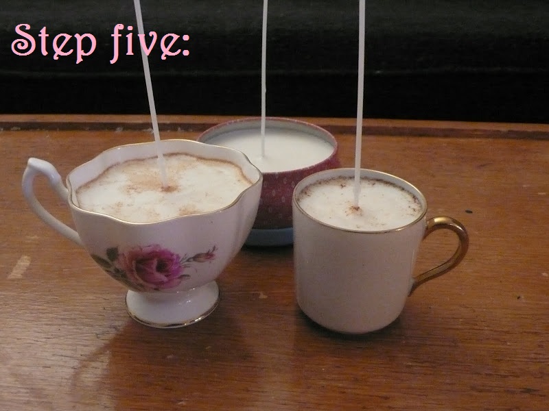 Make sure the receptacle you are using is clean and dry. For these candles I used teacups that I bought at Salvation Army for about fifty cents.