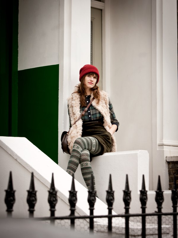 My favorite is the third one down. With the plaid shirt and the patterned tights and that cool faux-fur vest!