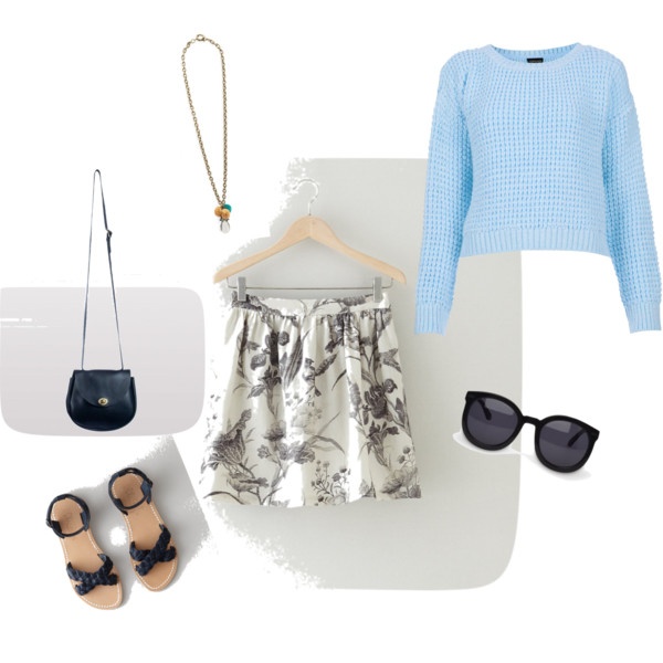 1. American Apparel leather cross body satchel … 2. Steven Alan criss cross Leather Sandal .. 3. Steven Alan Suzanne Skirt … 4, TopShop Knitted Cropped Jumper … 5. Raffia Crystal Pendant Necklace … 6. Karen Walker Super Duper’s