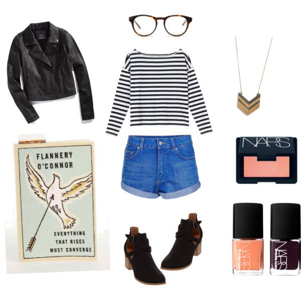 1. Striped Monki Top … 2. Madewell eyeglasses … 3. Madewell Arrowstack Necklace … 4. Nars Blush in Orgasm … 5. Nars Pierre Hardy Nail polish Duo … 6. Spurr Walker Cut Out Booties … 7.  Topshop Moto High Waisted Denim Shorts … 8. Veda x Madewell Black Leather Moto Jacket … 9.  Flannery O’Connor’s Everything That Rises Must Converge