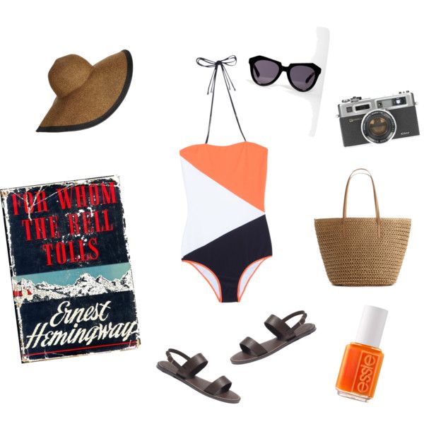1. Roksanda Ilincic One Piece Swimsuit … 2. Echo Design Floppy Sunhat … 3. Yashica Electra 35 Camera … 4. Karen Walker Number Ones …     5. Kelly & Kate Straw Tote … 6. Essie Nailpolish in Brazilliant … 7. Madewell Slingback Boardwalk Sandals …                                                                     8. Ernest Hemingway’s For Whom the Bell Tolls