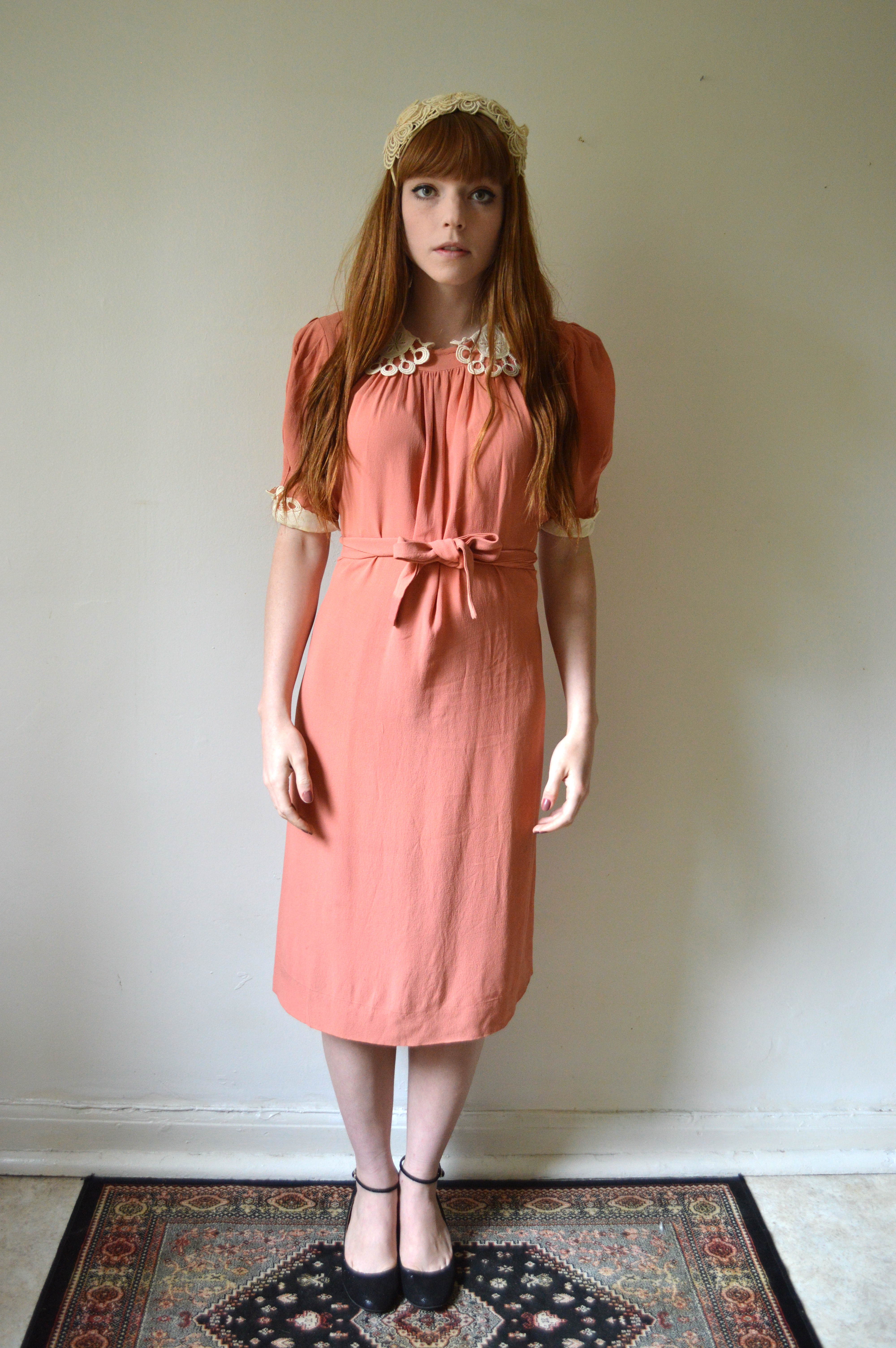 4….1940’s Rose Peter Pan Collar Embroidered Waist Tie Dress (S/M)
