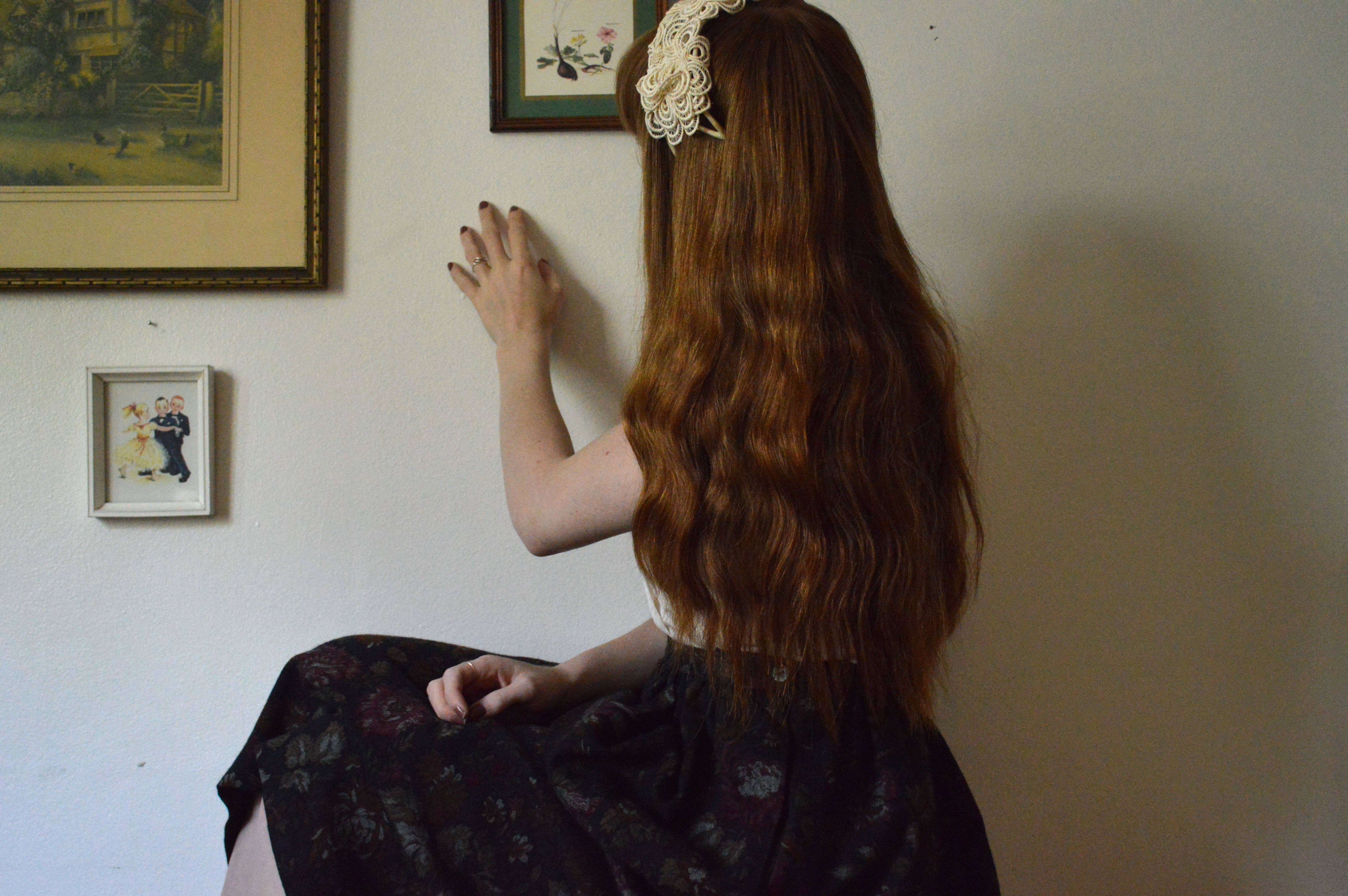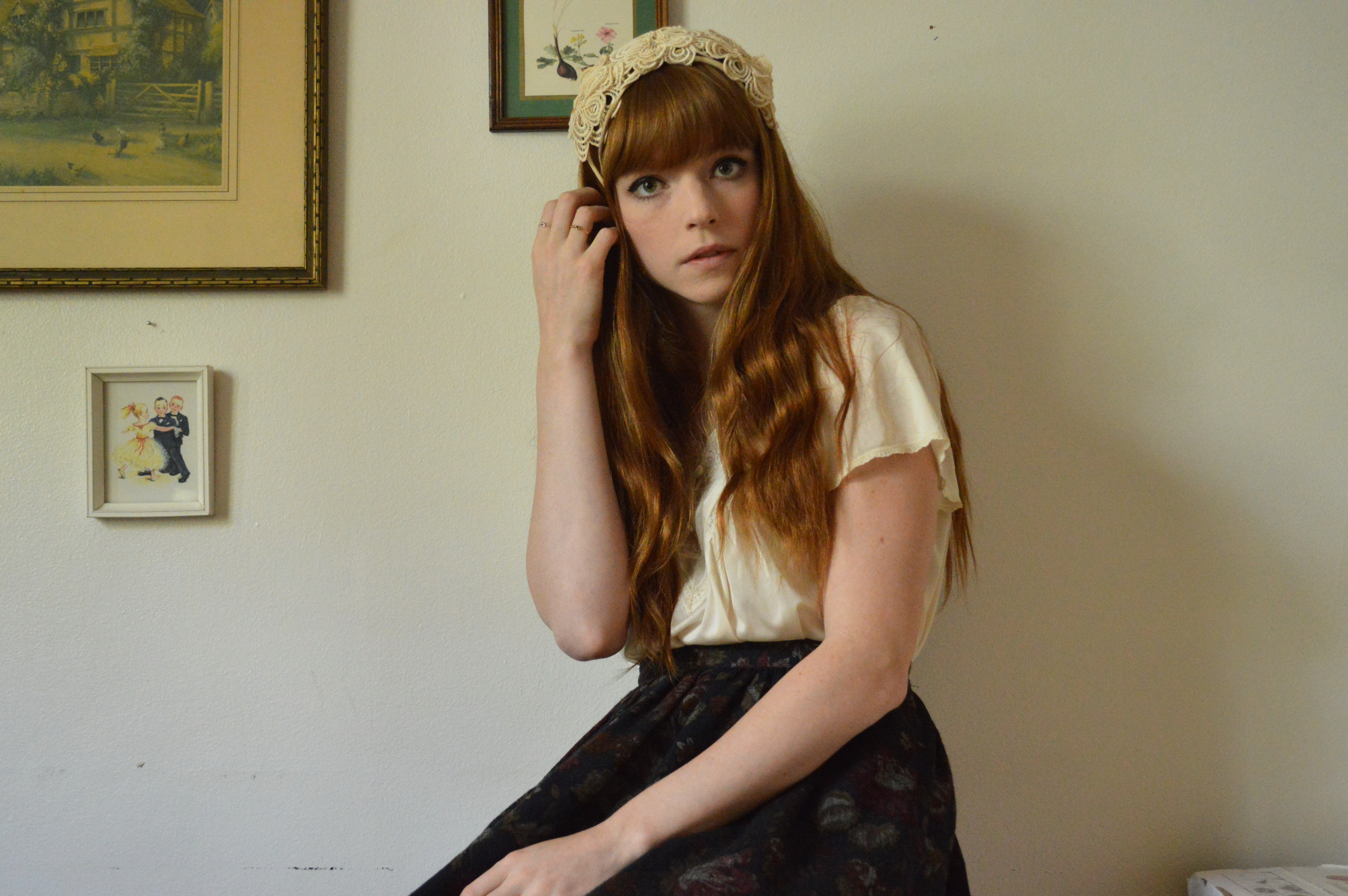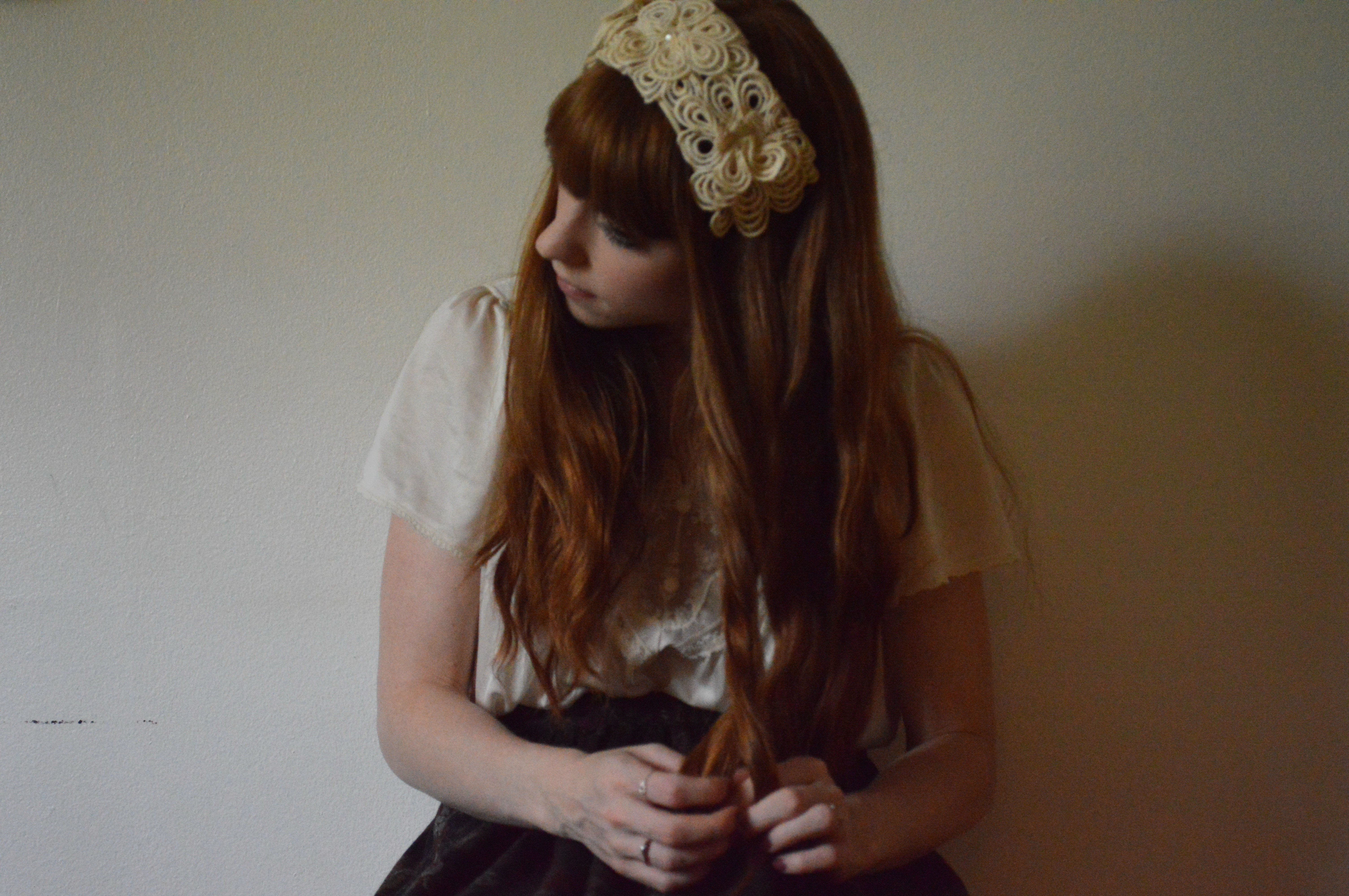 I would also like to mention finding this fascinator was a very pleasant surprise. It has the most amazing crochet flowers with three tiny rhinestones on the top layer. It came from this awesome vintage/antique store in Ithaca (the name fails me now, unfortunately). The shop owner was so sweet, and had a keen eye for such delicate and unique pieces. I struggled for a bit between this fascinator and some kewpie dolls with handmade clothing. Gah! I (obviously) ended up choosing the former, but it was a difficult decision, believe you me.