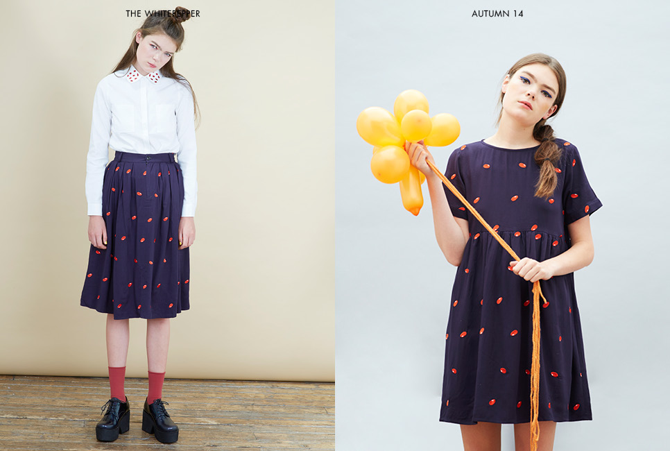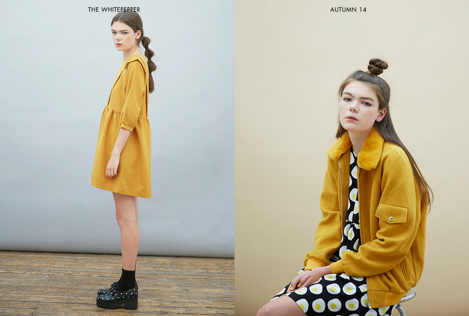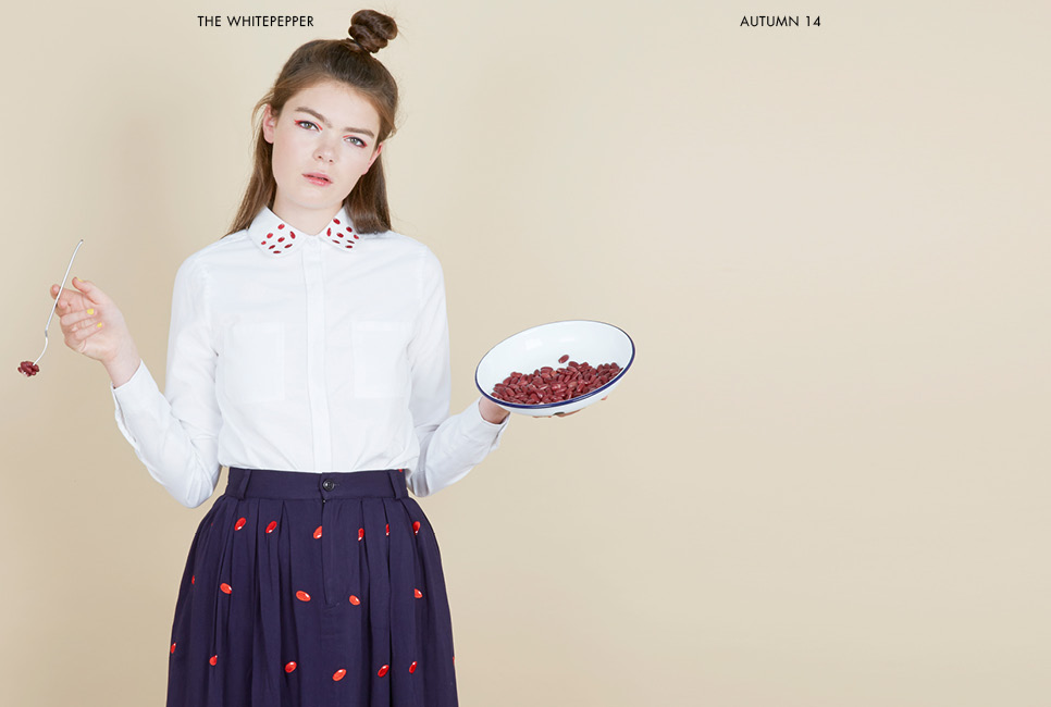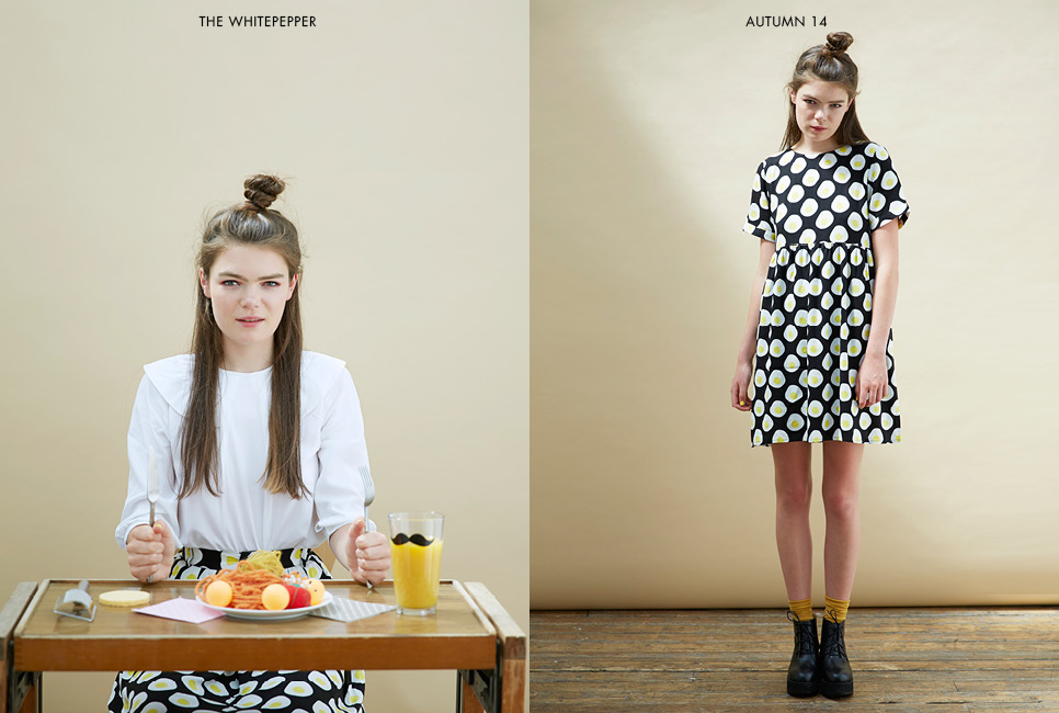 Autumn14THE WHITEPEPPER is one of my favourite brands. Their penchant for creating fun, youthful pieces has consistently been something that speaks to me. The A/W ’14 lookbook brings to mind “exhausted mom”, probably because of the shots of the model serving up white bread, weighing out baking ingredients, serving spaghetti with a sullen look. Its like if an angsty teenager were to become a mother, but way more comical than the real life thing. Now the clothes! I am over the moon for the egg print. I am seeing a lot of novelty print lately, but I don’t think I have seen this yet and I like it. The corduroy dungaree dress is quite possibly my favourite, and is a perfect example of the sort of thing I would like to be wearing this Fall (it scares me that I’m talking about what I’d like to wear in the Fall). We all know I’m a fan of oxford shirts, or well, anything button up really, so I’m especially loving this crisp, simple oxford shirt with one wonderful detail…embroidered beans!! And of course, we can’t talk about the WP without mentioning their signature loose-fitting babydoll dresses. It seems they always come back with some version of that dress, which I think is great, because you could own one with a different print/detail for every day of the week, like some sort of sassy cartoon character that never seems to change clothes and we don’t ever question it. I haven’t been that excited by clothes in a long while, to be perfectly honest. It’s the same thing over and over lately – minimalist, neutrals, shapeless, boring (in my opinion) I hate to say it, but curse you ‘normcore’ – This WP collection made me genuinely excited about clothes again. So thanks The WP, you’re the best.