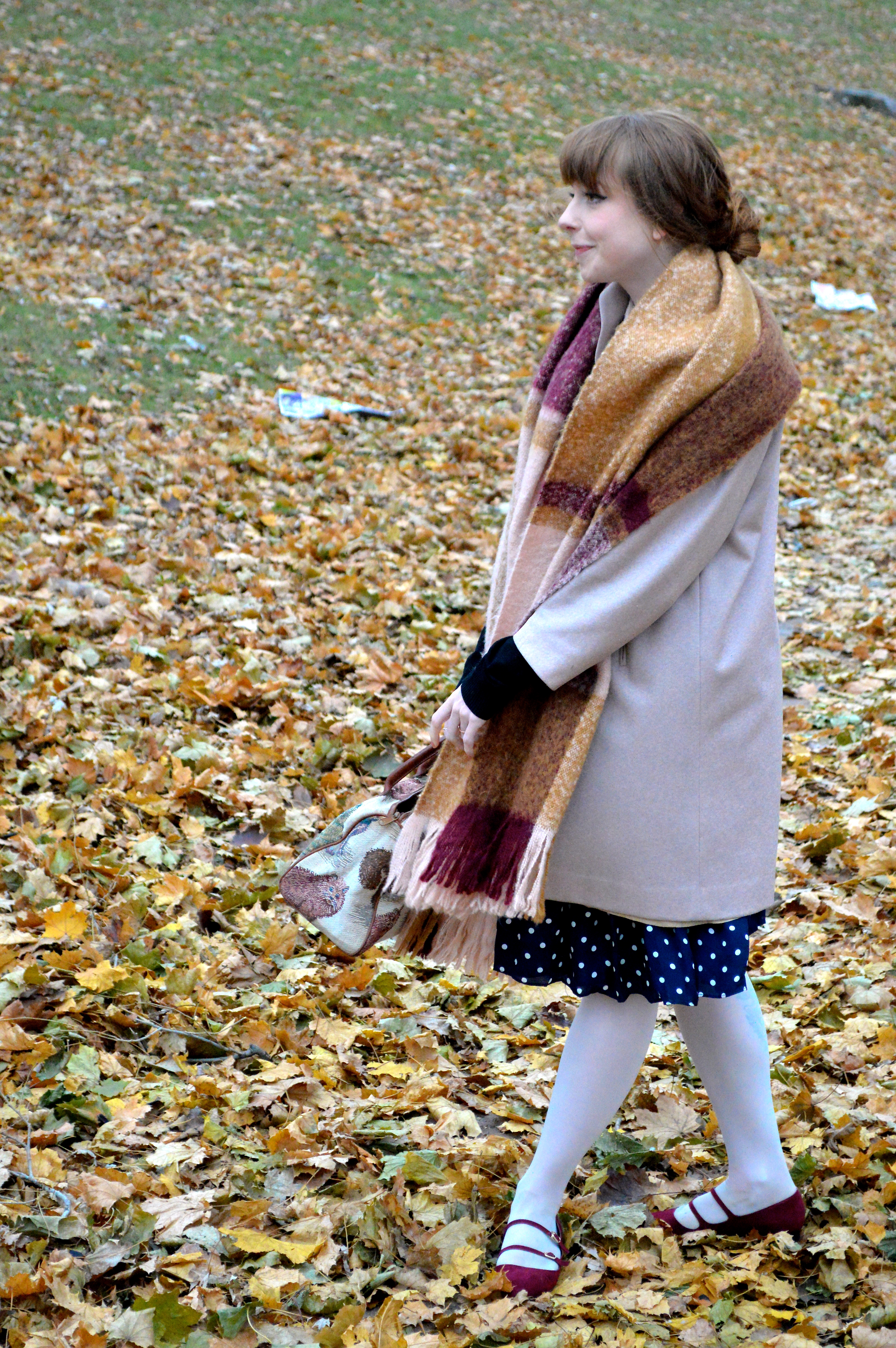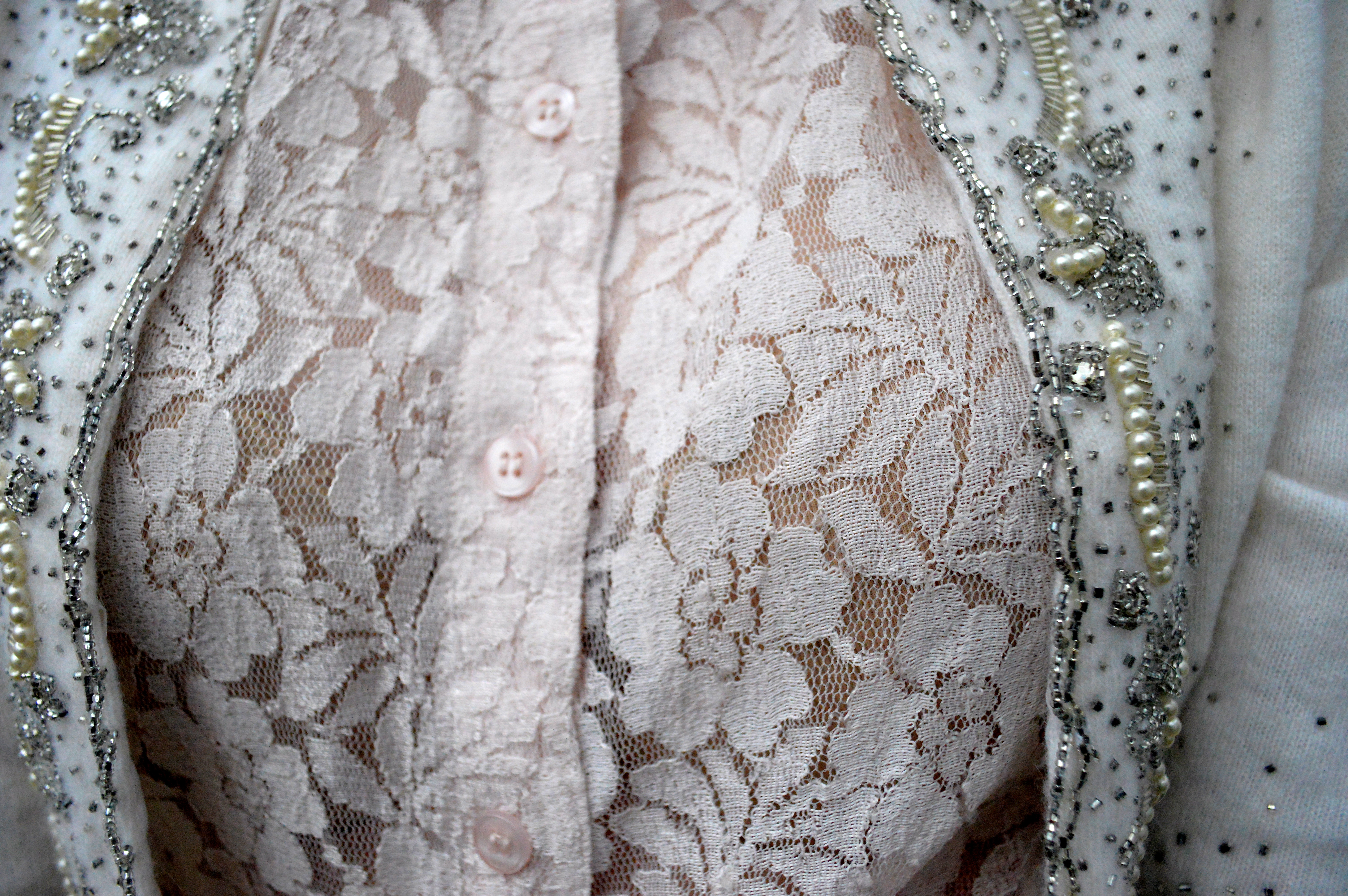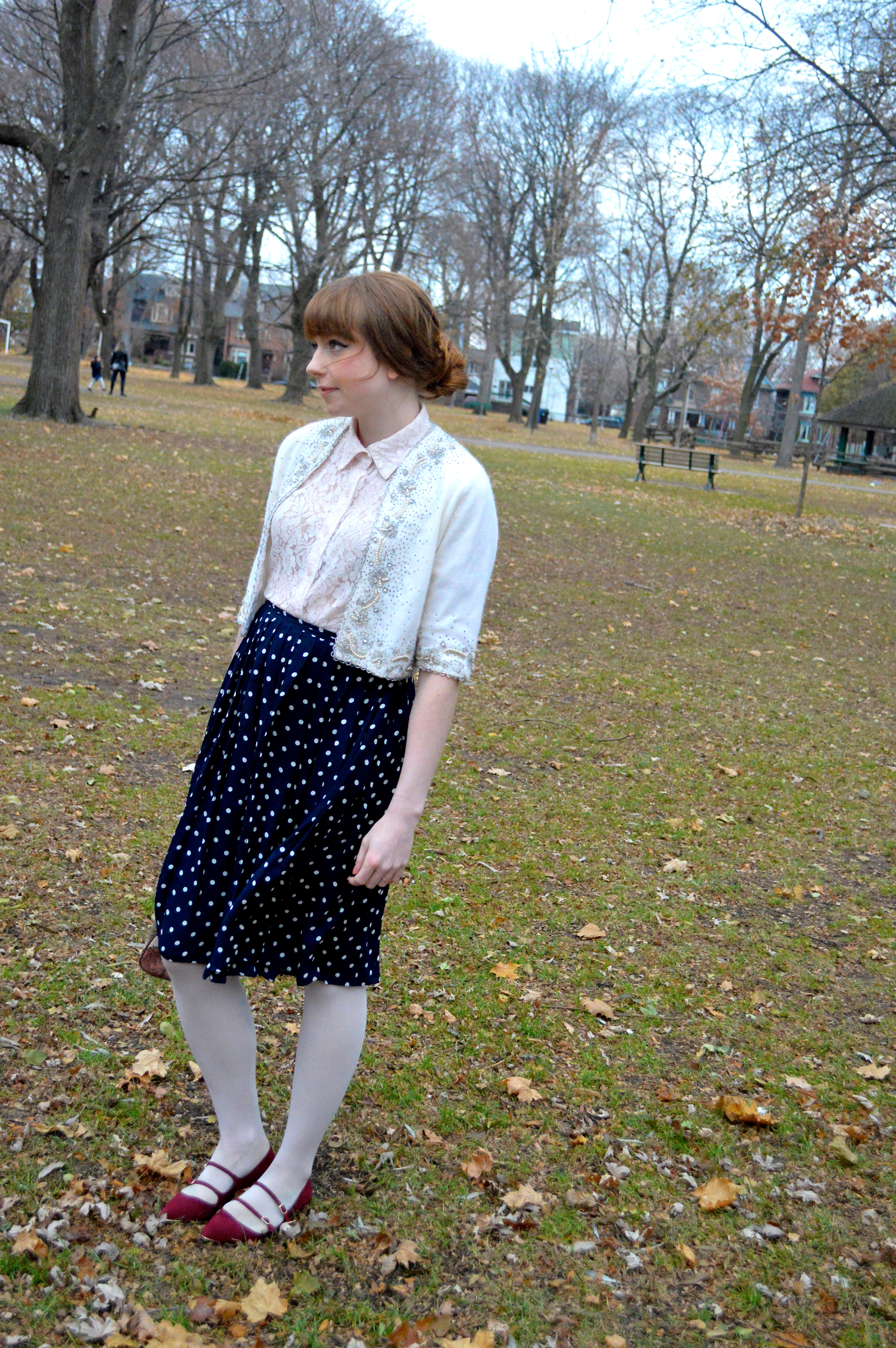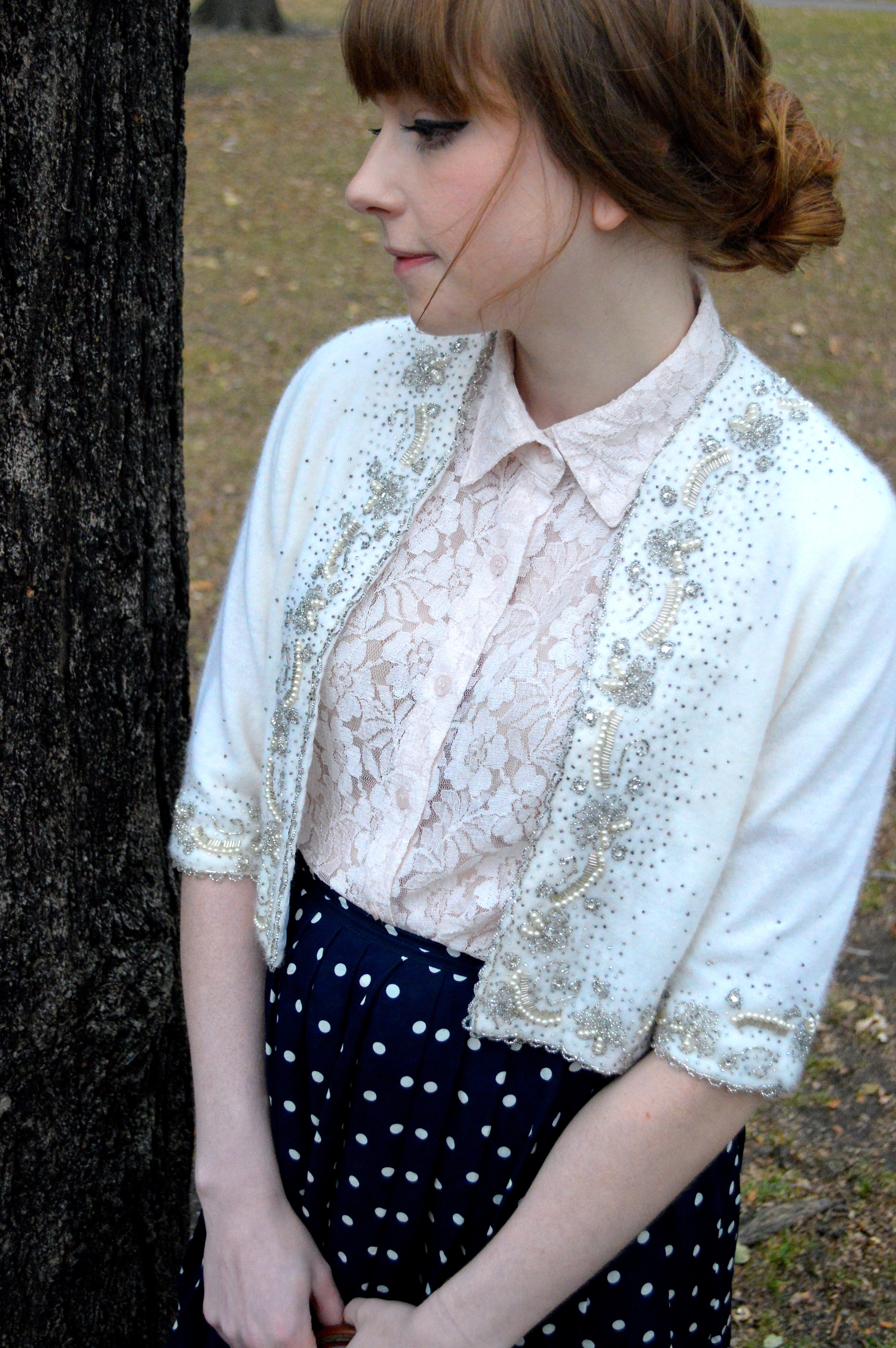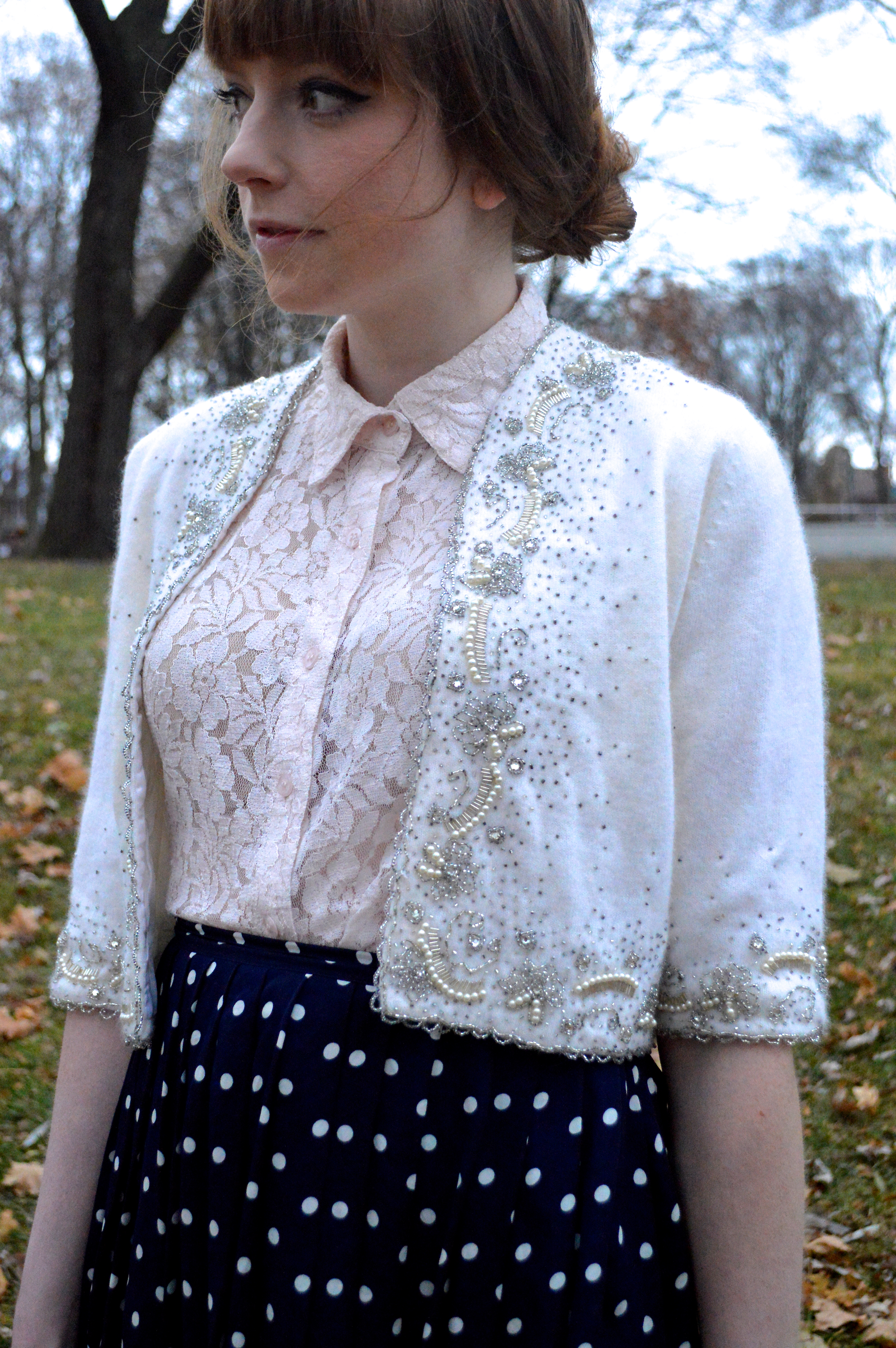 DSC_1436My hair being worn in any way other than down is a rare sight. If I’m being honest, I don’t much like the way I look with my hair up, but that feeling flip-flops. When I had short hair I didn’t mind having an exposed neck, and quite often when I was growing it out I would just throw my hair into a top-knot and go about my day (the top-knot was way better than the weird length it was at). But now that my hair is long it has become a pseudo-invisibility cloak of sorts. It hides all the things I am a bit self-conscious about (forehead, ears…), silly things really, but I’m sure I’m not the only one who feels this way sometimes. The other reason that my hair often stays down (or in a side braid) is that my hair is thick. When I’m at dance rehearsals I won’t even bother trying to put my hair up and out of my face because inevitably it will fall out after 2 minutes of moving around. The only way to ensure my hair will stay put in a bun or pony tail is a whole lot of hairspray and bobby pins galore. So what’s with the low bun in these photos then?! Well, sometimes after I take photos I realize my hair was covering some interesting and pretty details of my outfit. I really didn’t want that to be the case with this cardigan. I’ve been wanting to photograph this vintage dream for awhile and I originally thought I wouldn’t do so until around Christmas time…but well it’s close enough now, and there is no rule saying I can’t dress it up with a fancier holiday-inspired outfit later on like I intended. I’m still unsure how I feel about this low bun – although it’s still sort of on the safe side since it’s covering the things I always try to hide – I doubt it will become a go-to hairstyle for me, but I’m really glad my giant mane was not in the way of getting some nice photographs of the beautiful bead-work on this 1950s mohair cardigan.