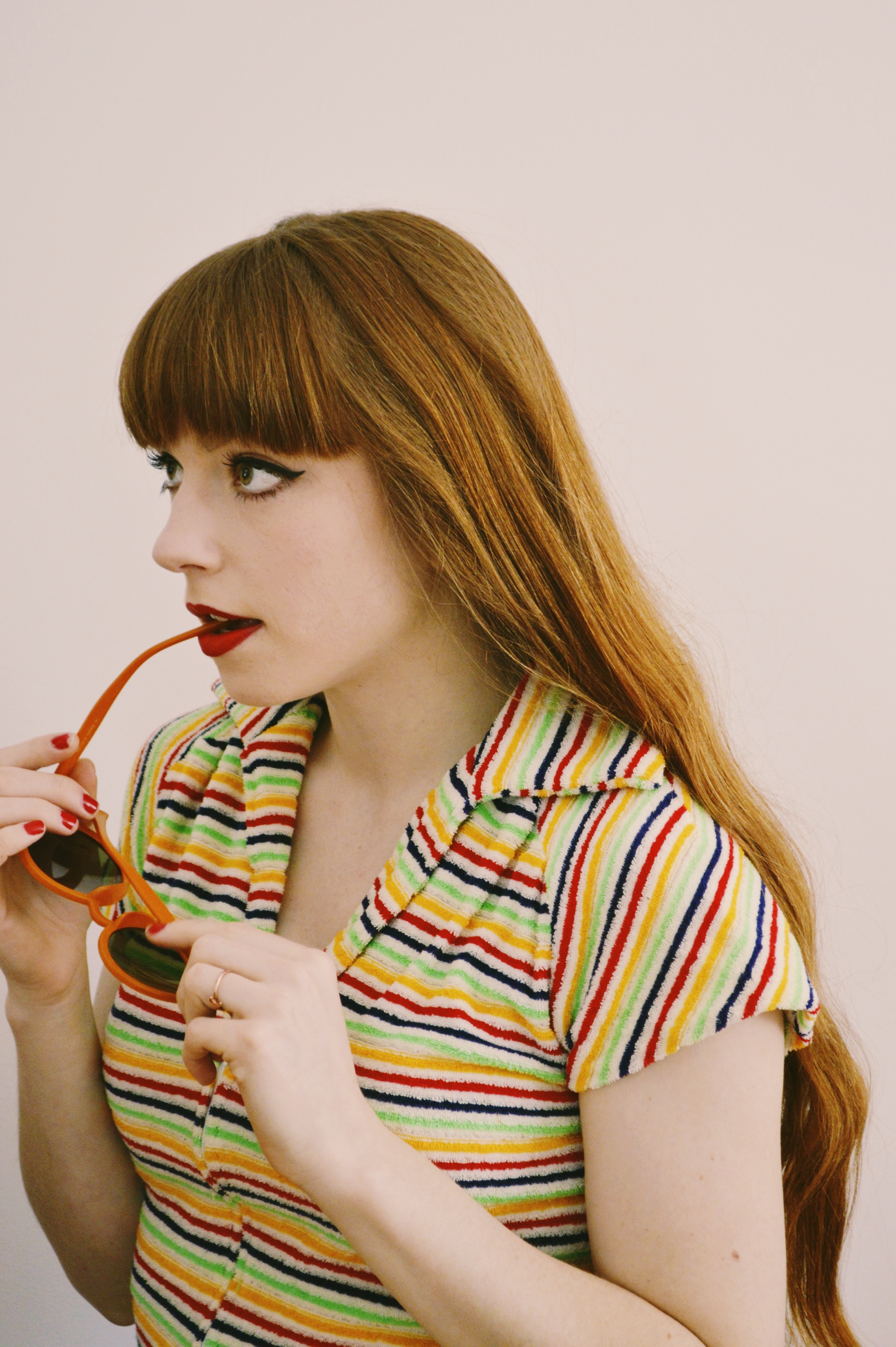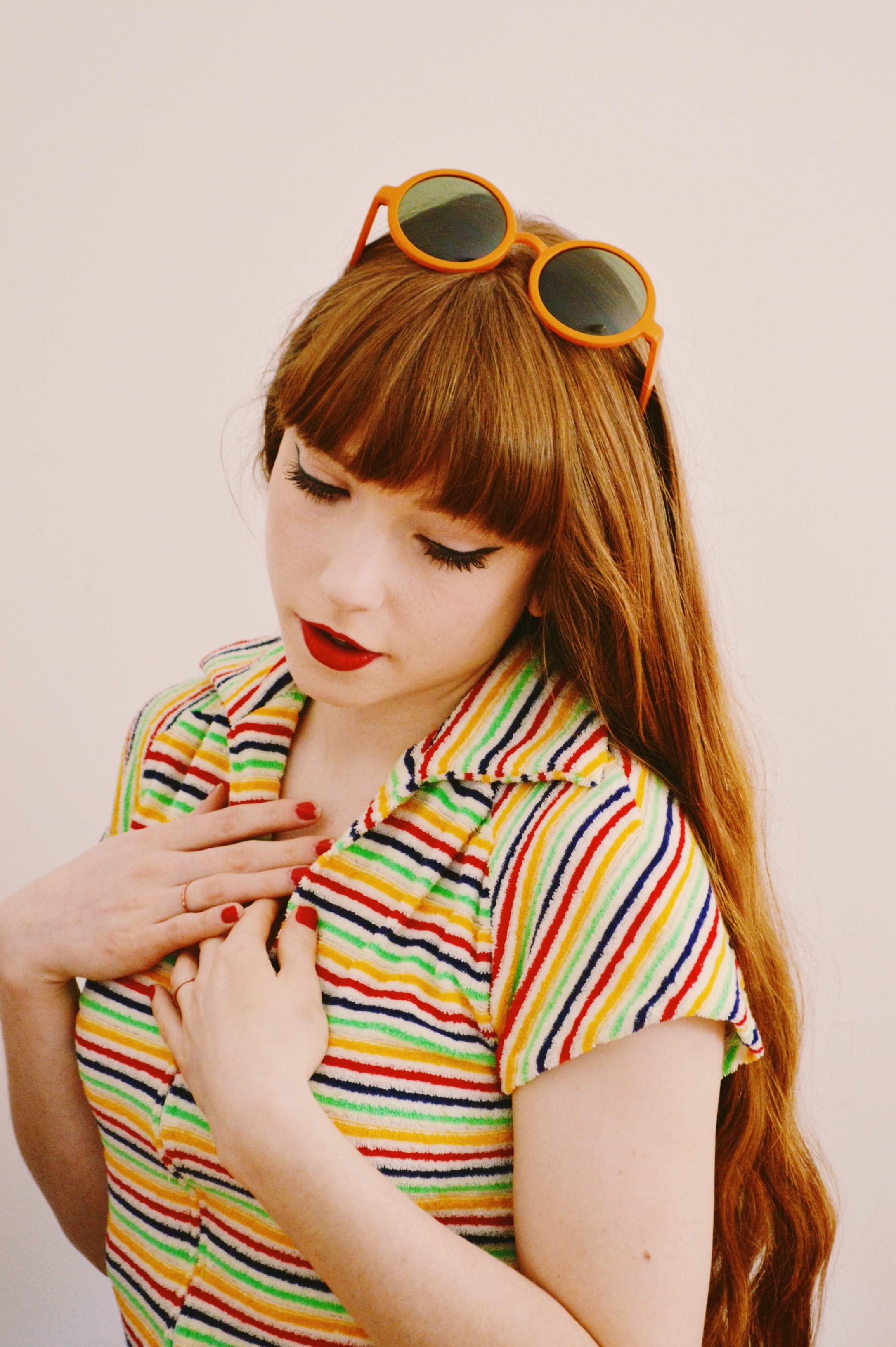 This winter really feels like it’s taken a toll on me. Trying to stay motivated and positive has often felt like a daunting task when sunshine is limited and the days look grey and dreary, and are cold as all hell (maybe hell is warm?) But I found this 1970s terrycloth romper at one of my favourite vintage stores and it immediately put a smile on my face. It reminds me of summer and Life Savers candy, and just happiness in general. So I thought to myself instead of waiting months to be able to wear it in the warmth, I’d bring the sunshine indoors by pairing it with some other bright accessories that put a smile on my face. And maybe one day I’ll move to a place that doesn’t freeze my toes as soon as I step outside.