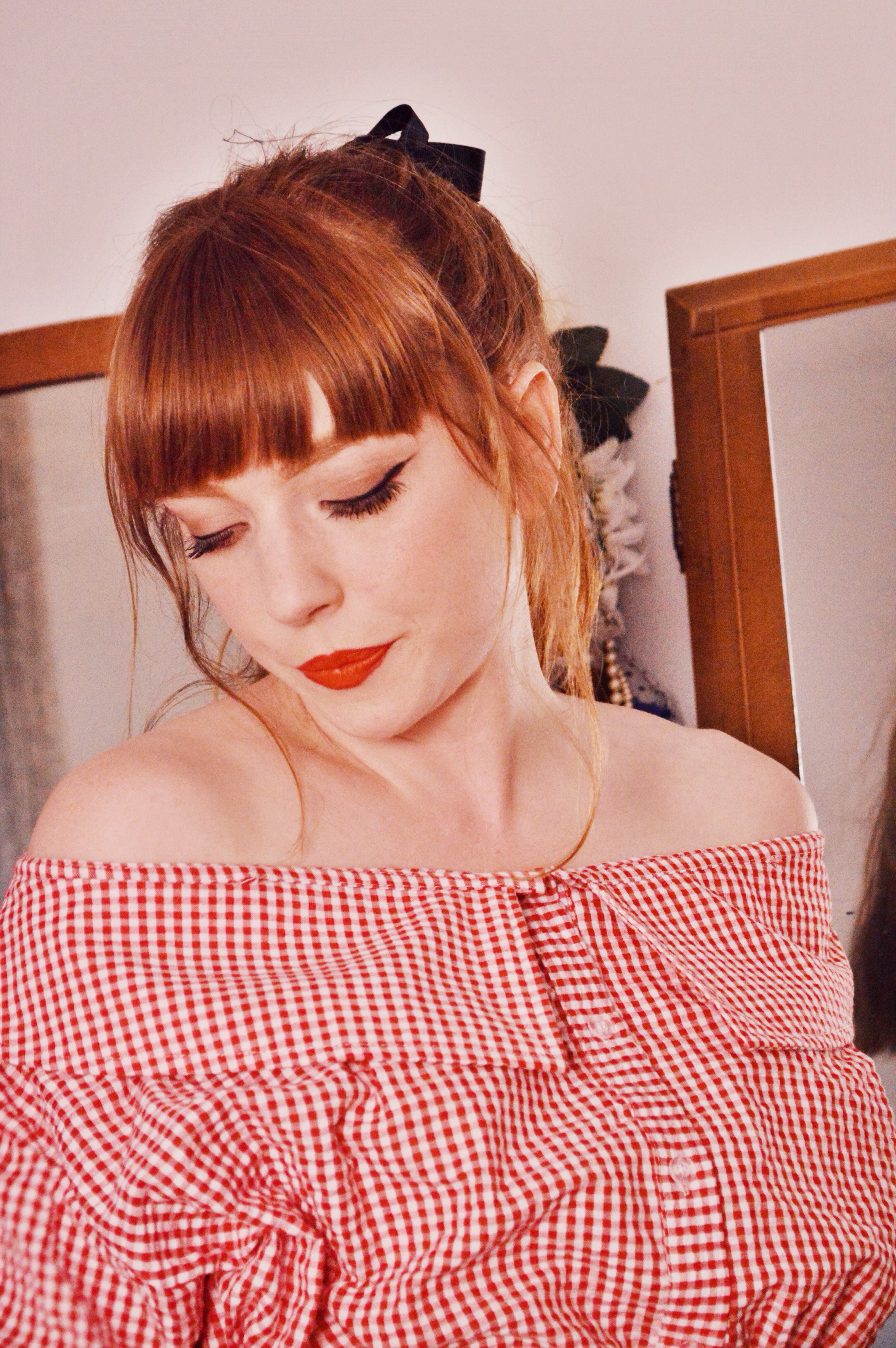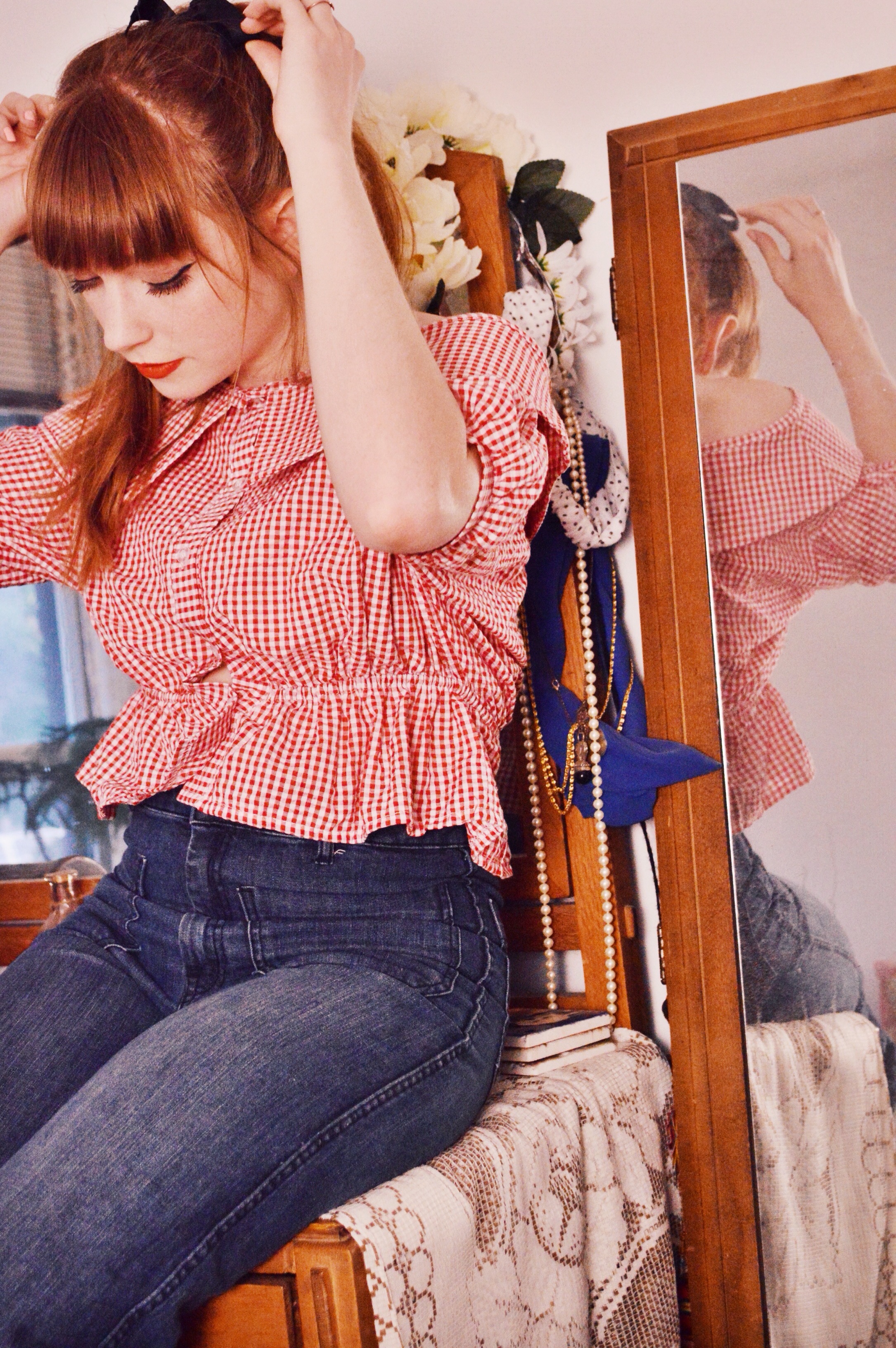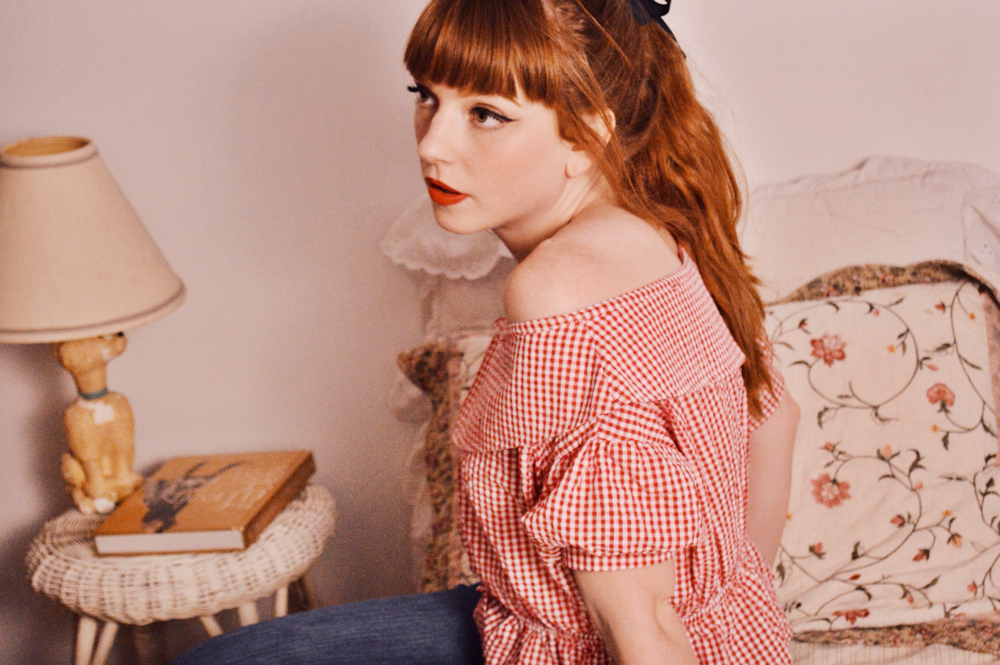 As for what I’m wearing, I’ve been living in these jeans. I know right?! Weird. To be honest, not so much recently because it has been brutally hot, but before these last few weeks I had been wearing them constantly. When I received this gingham, off the shoulder peplum top, I knew it would pair splendidly with my flared jeans…as most tops do, actually. The top originally had little straps going over the shoulders, but honestly, they felt kind of useless and looked awkward as they wouldn’t sit properly on my shoulders, so I chopped them off and am much more pleased with this top now. I think this is the one and only off the shoulder item I own, and I kind of love it. The only issue that comes to mind is lifting your arms without everything becoming bunched and weird…do people just not move their arms when they wear off the shoulder? Is there some trick I don’t know about? I’m really interested to know.
