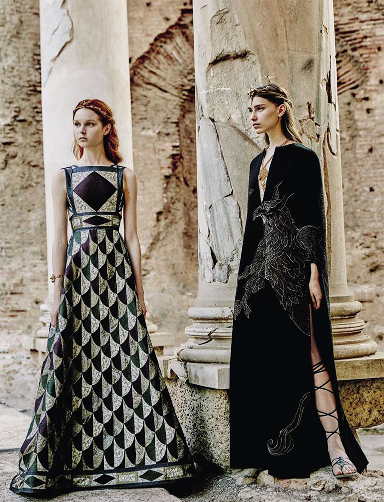 As much as my days of all black dress, dark heavy eye makeup and ultra gothy vibes have passed me by, I still get pangs of excitement deep in my chest whenever I see anything styled remotely Gothic and Medieval. So it’s no surprise these images in Vogue Italia made me stop dead in my tracks. Valentino always, always brings out some of the most stunning garments that seem more works of art than actual articles of clothing, but it no less makes me wish I was the type of person who had a place to wear gowns of such luxury. The starting point for this particular collection was Rome, which feels like the most suitable place to adorn intricately embroidered gowns and heavy metallic accessories with a stoic disposition. I wish I could transport myself into these images so I could be a part of this gothy, sullen world. When in Rome, right?!