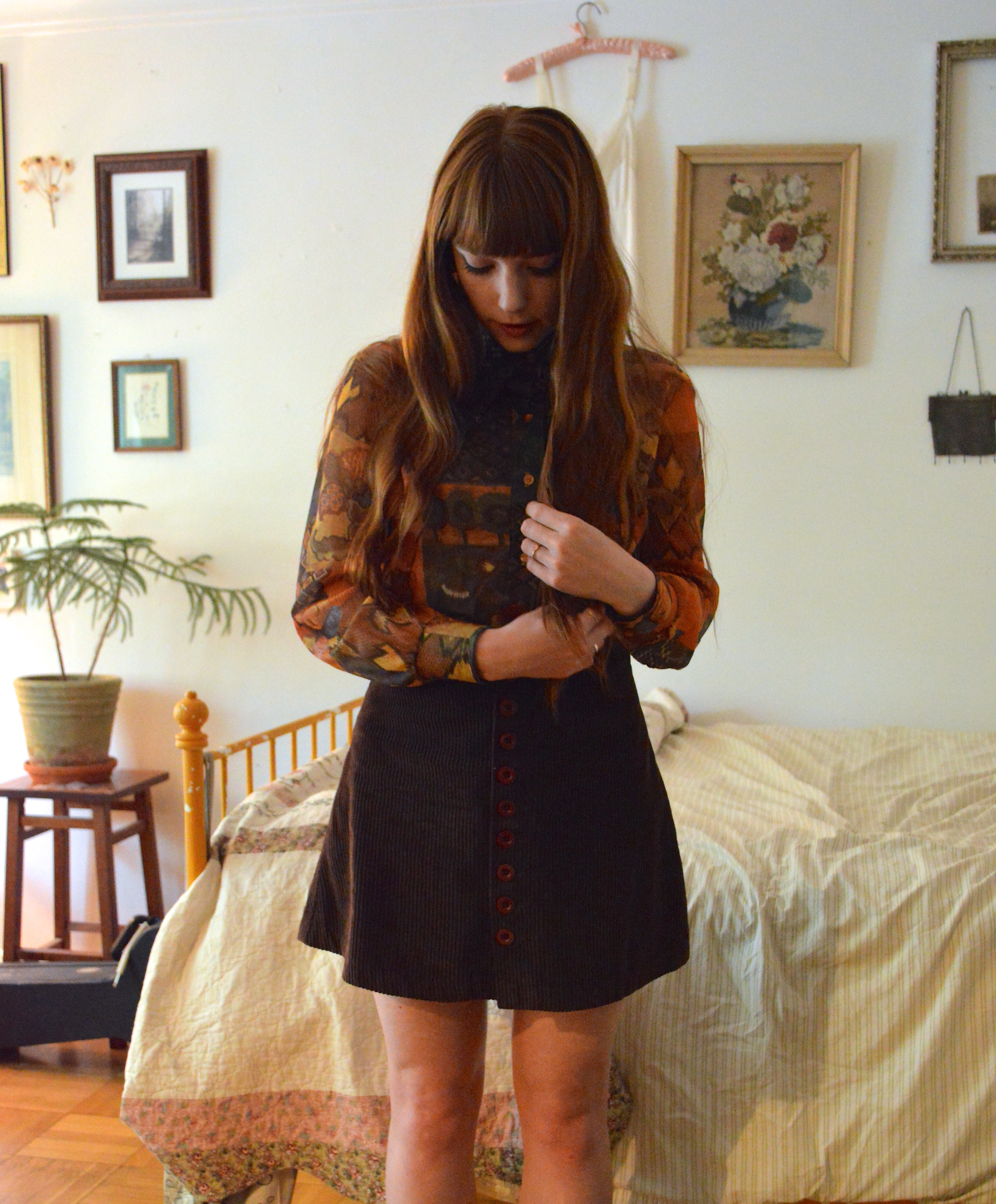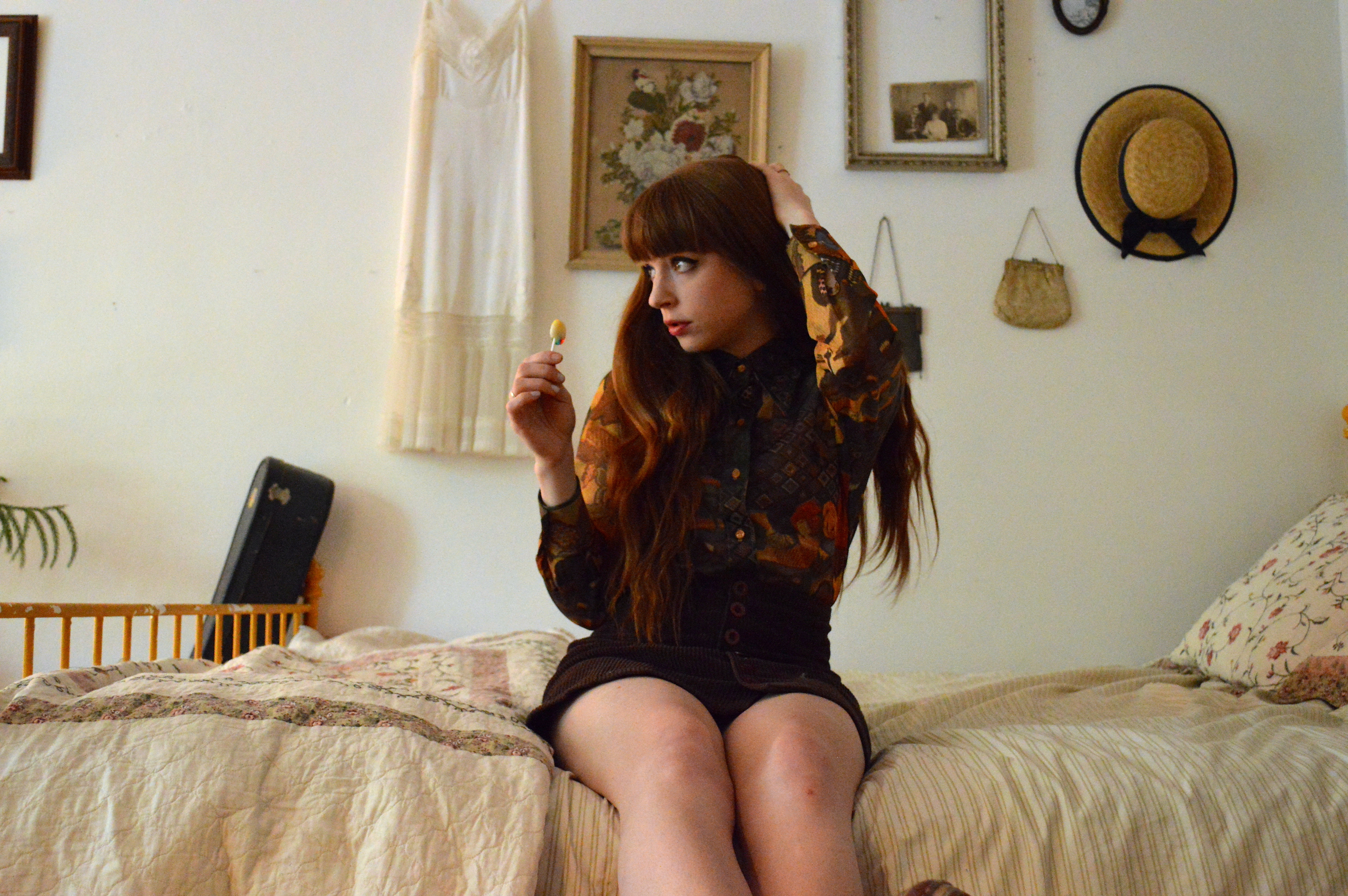FIFTH STEP: In the morning I often use my blow dryer on the little bundles even though they are not wet because the heat will help to keep the curls intact. Make sure if you do use the blow dryer to let the curls cool down before taking them out. Now, un-tie your knots and slowly pull the bottom piece of the rag downward so you don’t upset the curls. Once I’ve taken out all the rags I give my curls another spray with my trusty hairspray just to be sure they don’t get out of line, then I just give the top, uncurled part of my hair a little brush (since I slept on it) and I’m good to go. You could also tease a bit of the hair at the top of your head to get that ultra 60s look, which sometimes I do.