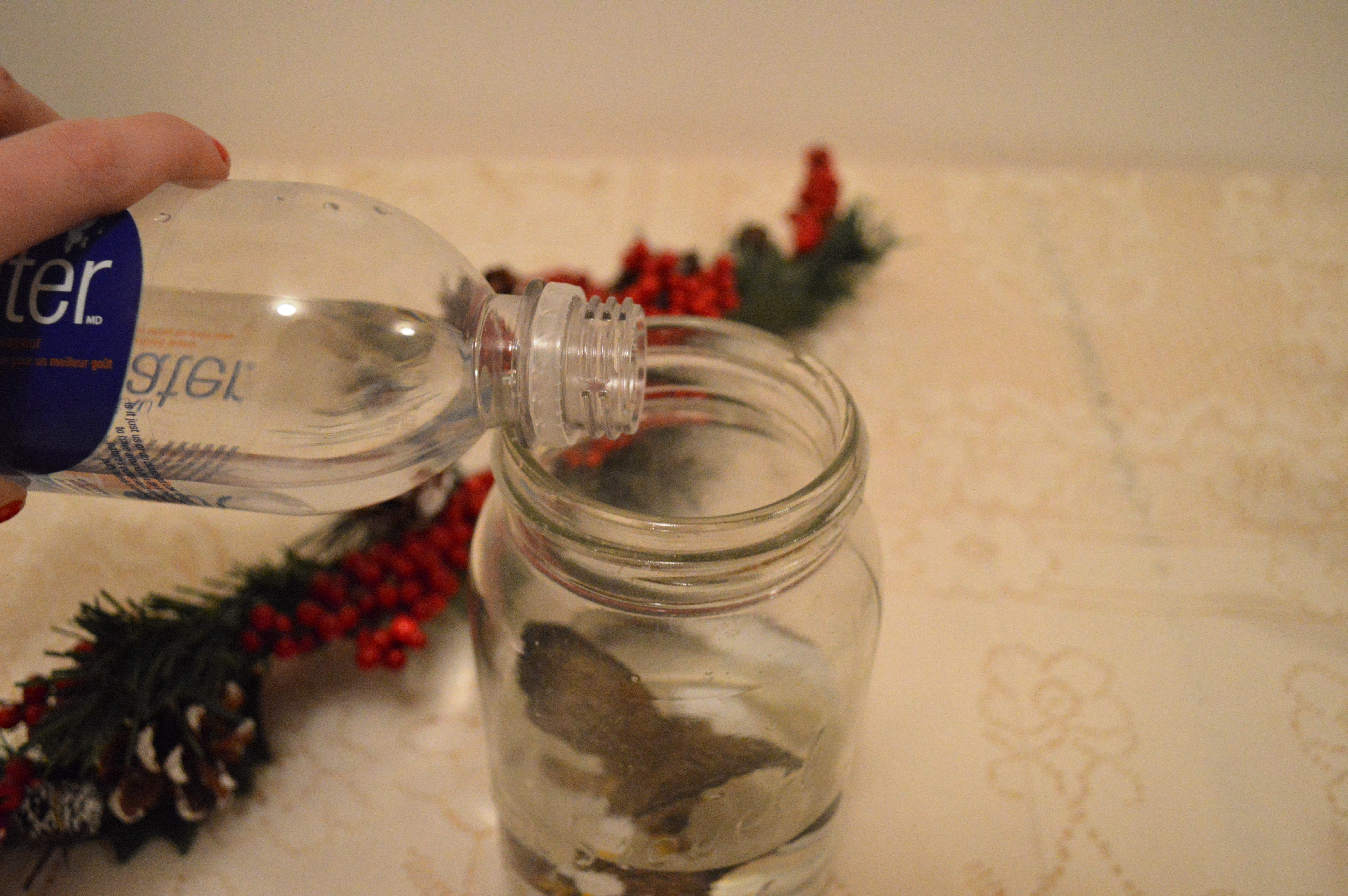 I left the glue to dry for 24hrs, but most glues will tell you you can wait 1hr. The longer it’s left, the better the hold. Jiggle your jar around a bit to make sure it’s secure, and then you can begin pouring your distilled water into the jar. I never fill the jar to the brim – a few inches before the brim will do just fine. Once your jar is a cool filled guy, add in a few drops of glycerin. Don’t get crazy now, a few drops will do.