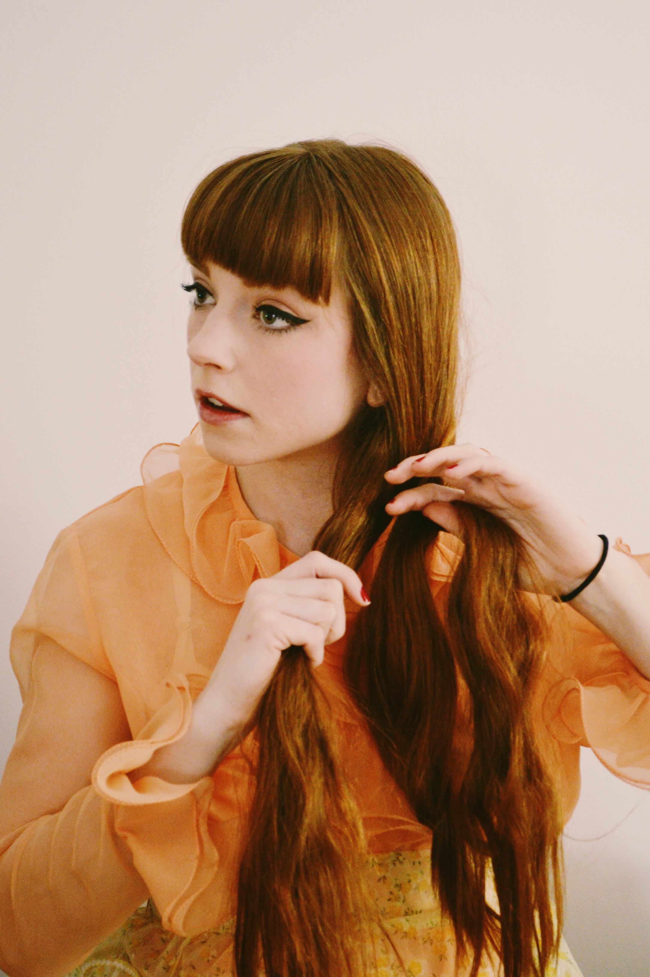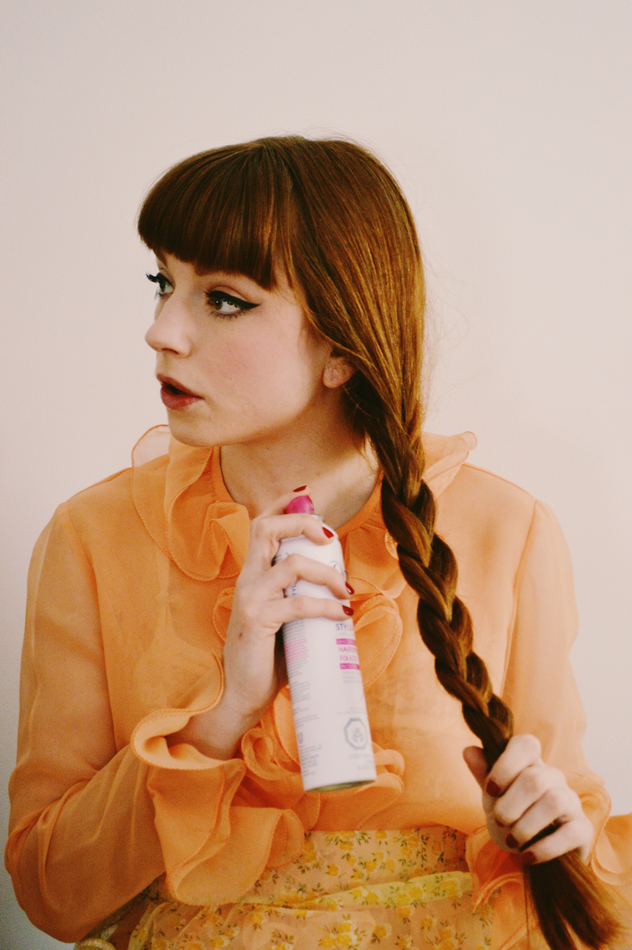 7. Since I have straight across bangs (fringe) and Miss Bardot has short, center parted bangs, I made sure to do my usual fringe styling routine, only this time I use my blow dryer to guide my fringe to the each side creating a part in them.