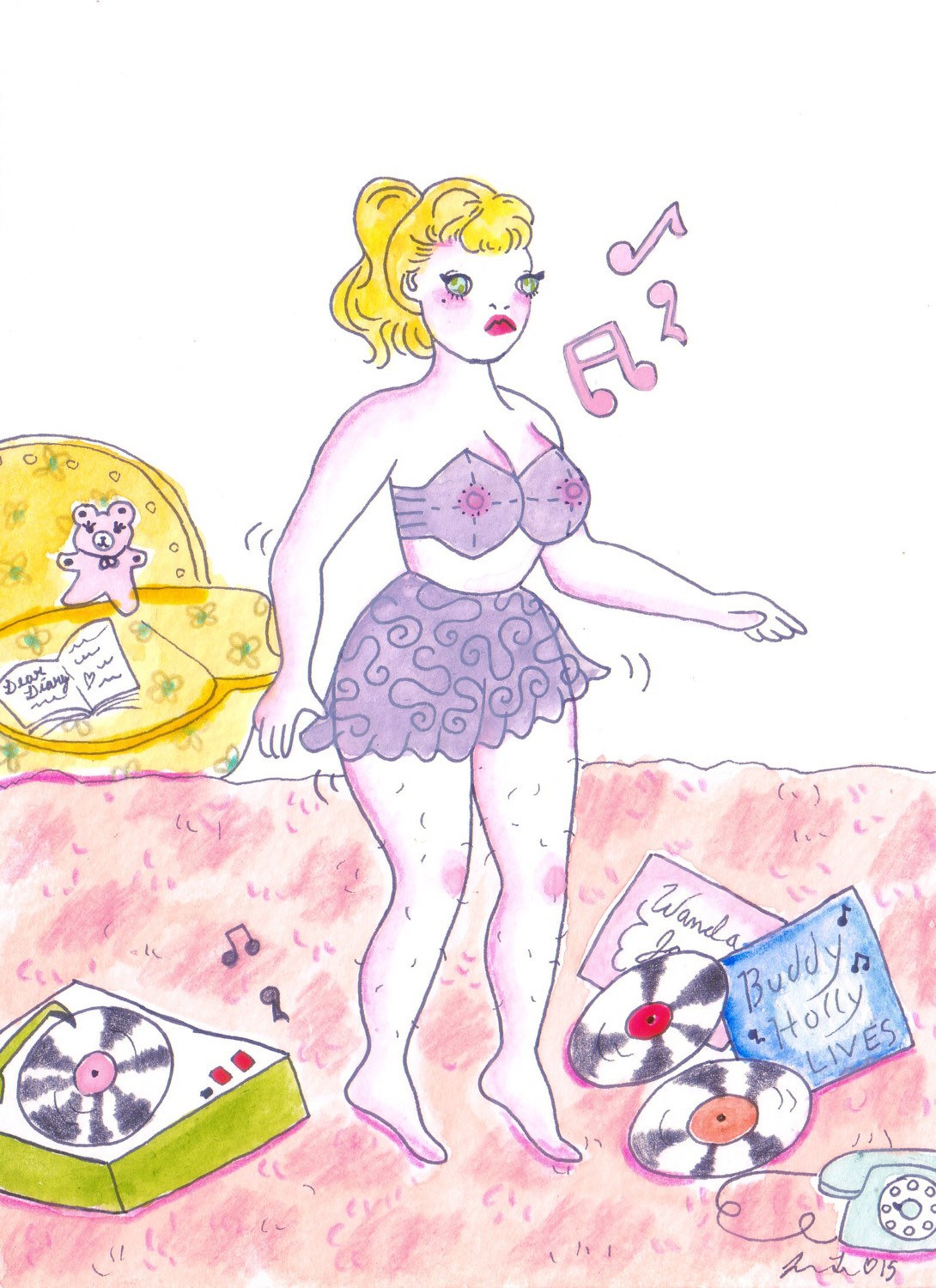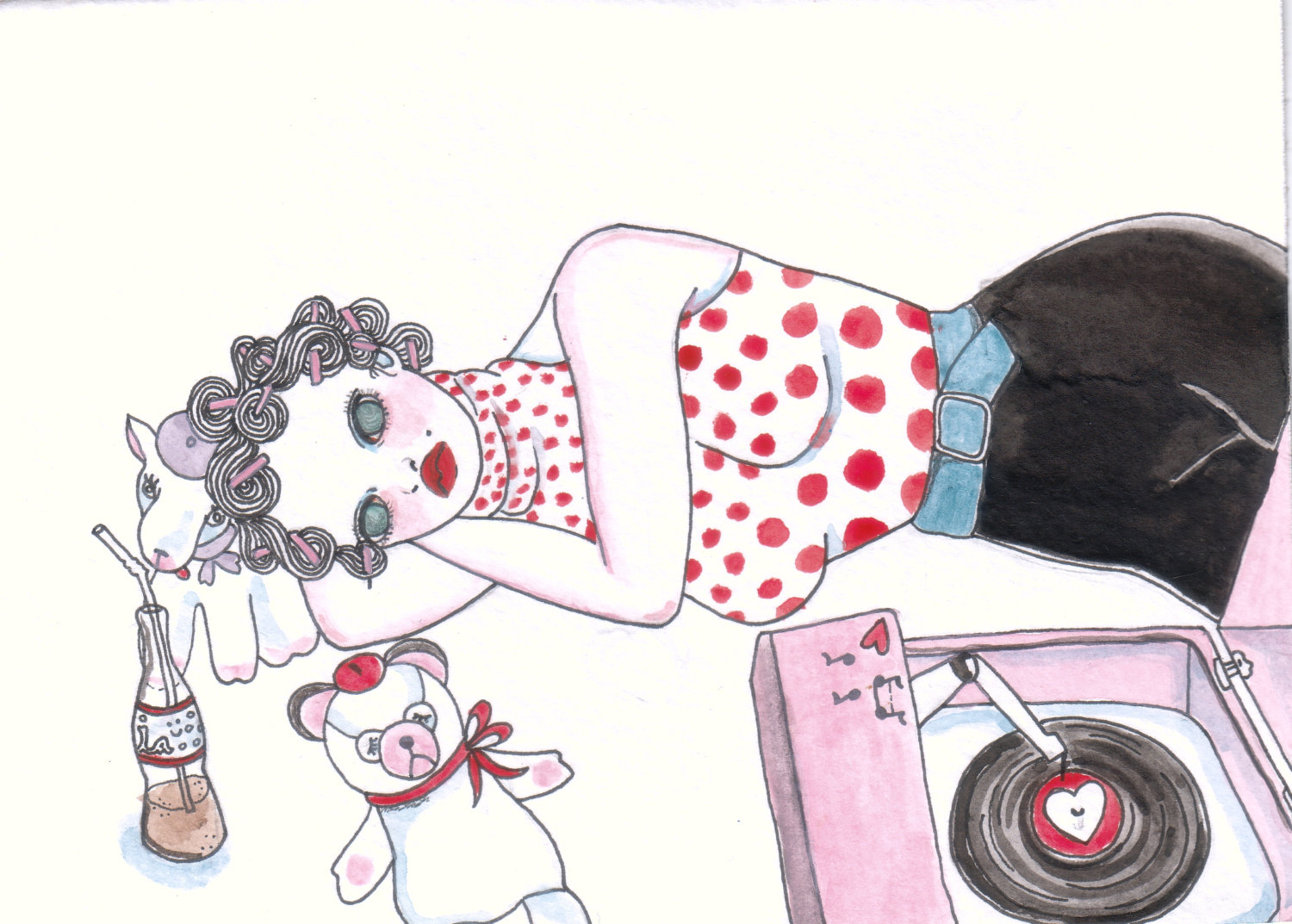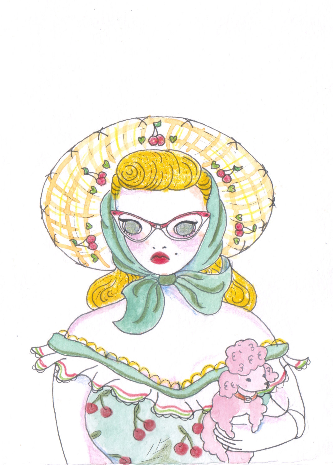 I found Jenee Larson’s artwork through instagram quite a long while ago and was instantly taken by it. The first thing that struck me was her adorable little illustrations of toy poodles. If you have been reading this blog for a long while, then you know how much I love little fluffy dogs, so someone drawing them as adorable pink cutie pies is right up my alley. But once I started to browse her works, I found I loved so much about it- colourful, feminine, painfully cute, dark humoured, vintage-inspired, sexually suggestive – a mix of so many wonderful things, it’s hard not to fall head over heels. Now the difficult task of deciding which prints I would love to have for my own.