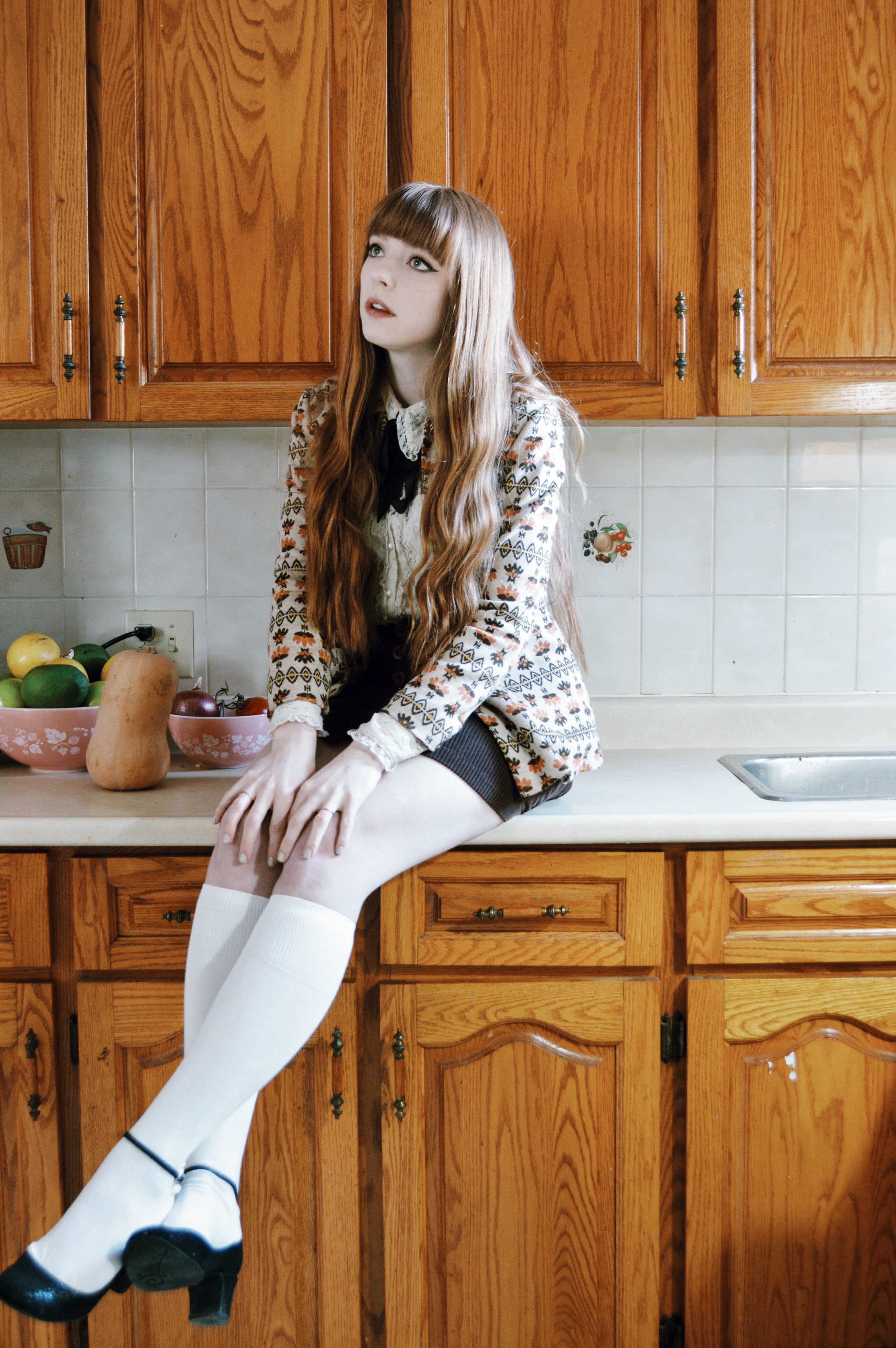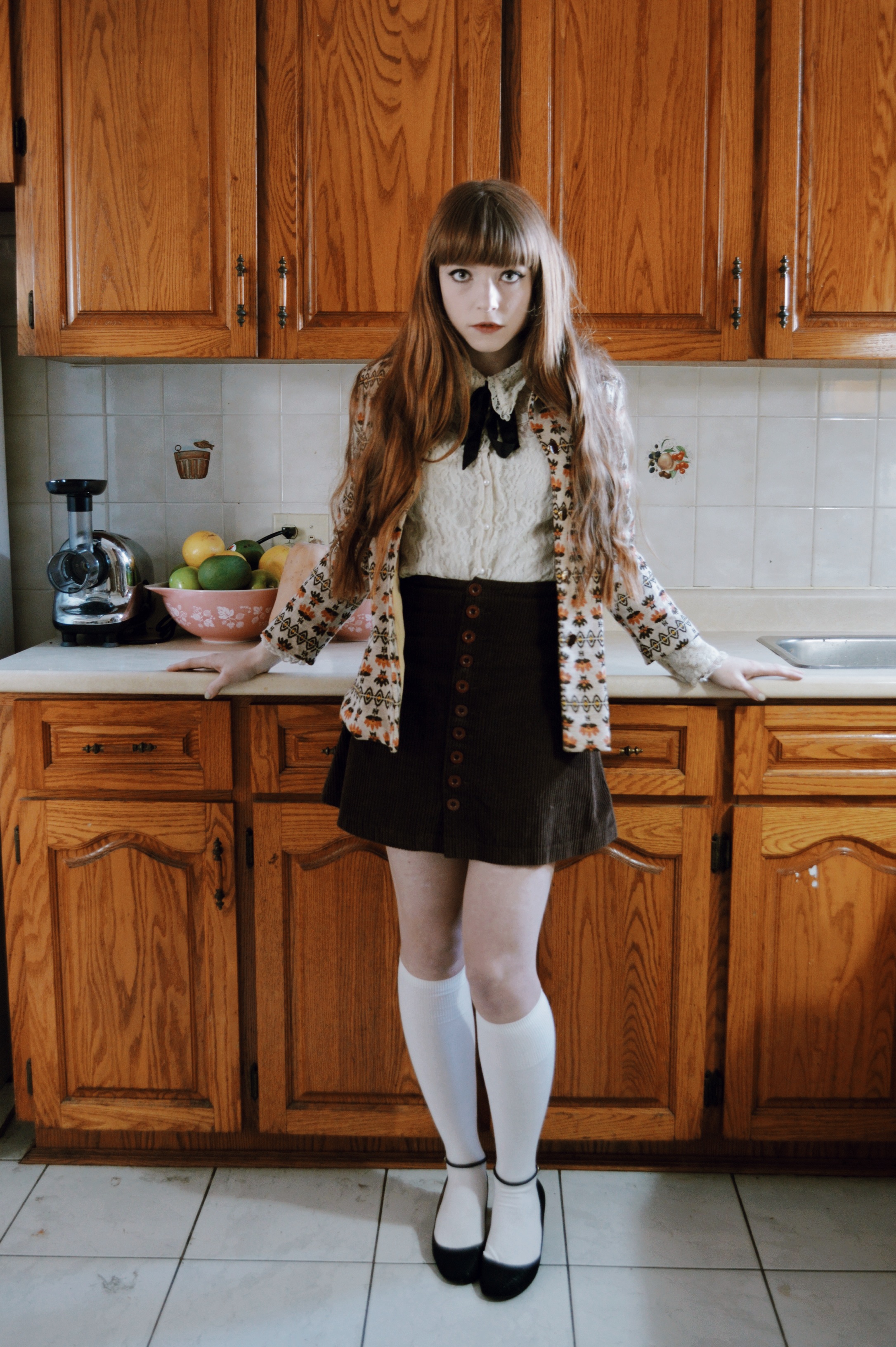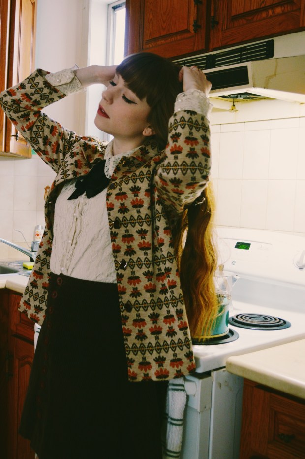 With temperatures under -30C it would be ridiculous to even fathom the idea of heading outside to take photos, which is just as well, because I don’t think I could do this outfit justice under layers of scarves and coats. This 70s suit jacket is one of those articles of clothing I bought just because of it’s print and cut, but I did not give much thought to what would pair well with it, so up until very recently it had been collecting dust in my closet. I had very close to forgotten about it when I spied it with what felt like fresh eyes, and I instantly thought of pieces that would look perfect with it. There are not many things in my closet I have trouble styling, this jacket was one of the few that stumped me time and again. I guess when I had bought it I just didn’t own anything that looked right with it. I know a ton of bloggers suggest not buying something unless you can think of several ways to wear it, but I’m of the mind that if I feel the piece is special and unique (and fits me right), then I will buy it and find a way to make it work. I’d rather have my closet full of pieces that are dear to my heart and make me think outside the box in terms of styling instead of just playing it safe.