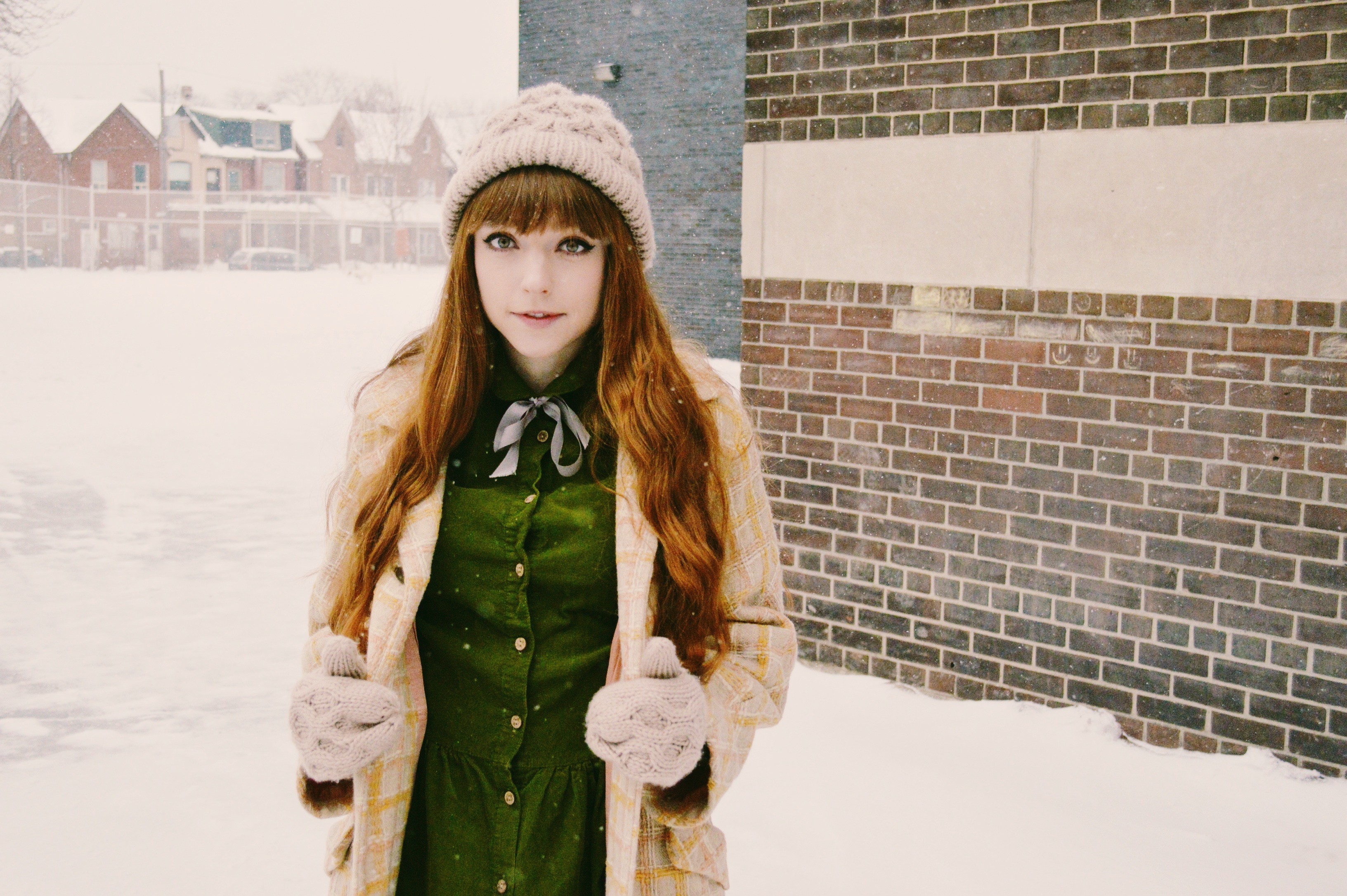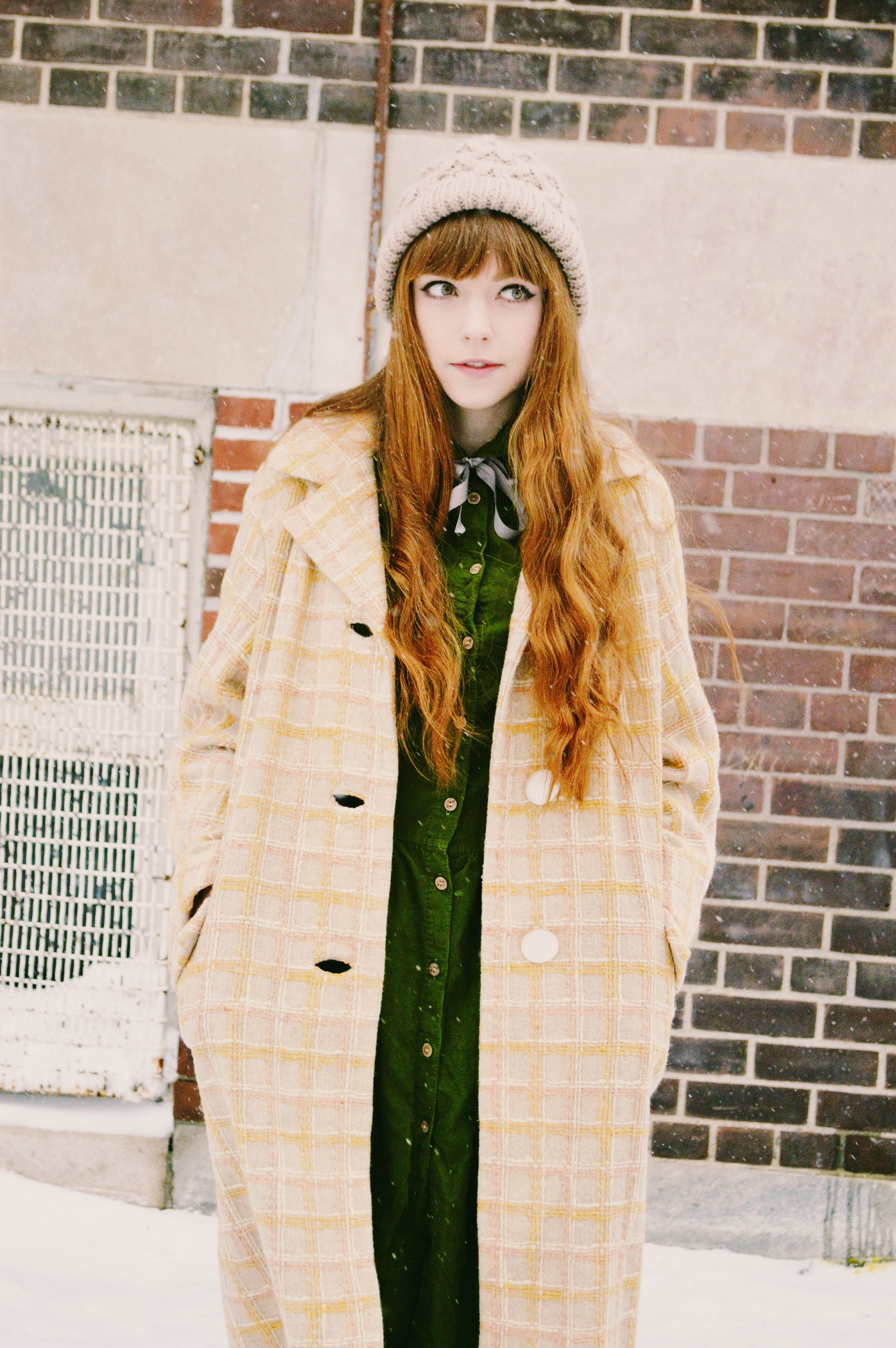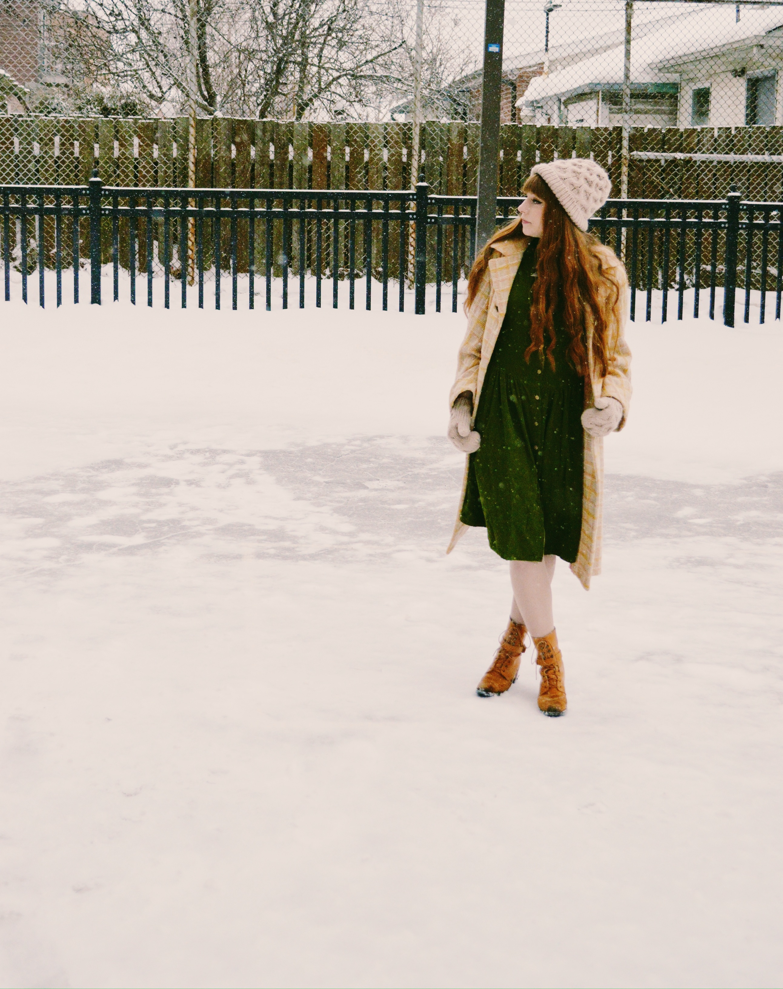 Lately It’s been cold…real cold, and snowy, which is fairly normal when you live in Toronto, but that doesn’t mean I’ve ever fully gotten used to it or have any desire to spend time embracing it. On the weekend I was supposed to be styling a shoot with Gerald in Brantford, but the morning of the roads were just too dangerous to drive on. I had to admit defeat and accept that styling a shoot was just not worth the possibility of a car accident (I’ve been in several car accidents, which is probably why I have never learned to drive myself…ya, I’m 26 and I can’t drive). I spent the majority of the weekend in doors watching Netflix, eating tasty things and cuddling the dogs. However, Ryan and I did venture out Sunday afternoon to shoot these photos. While the winter may be cold, and I don’t much care for snow, it does make for really pretty pictures, and I thought my new dress would look perfect against an almost all white background. I don’t own many shapeless, drop-waist dresses like this. My person is quite small, so I find really boxy silhouettes to be a bit too much for me – I just sort of drown in them. But I love this dress. It’s so comfortable and it’s the perfect item to wear if you just want to lounge around. I liken it to a nightgown of sorts, which obviously pleases me. And this coat, oh this coat! I love this coat! It’s hard to tell, but the tartan on it is in mustard, white and blush pink, and the inner lining is a beautiful blush satin. It’s a bit oversized for me and thus looks strange buttoned up, but I had to have it just based on the colour scheme. So here we are, stepping out of my comfort zone and embracing the shapeless life.