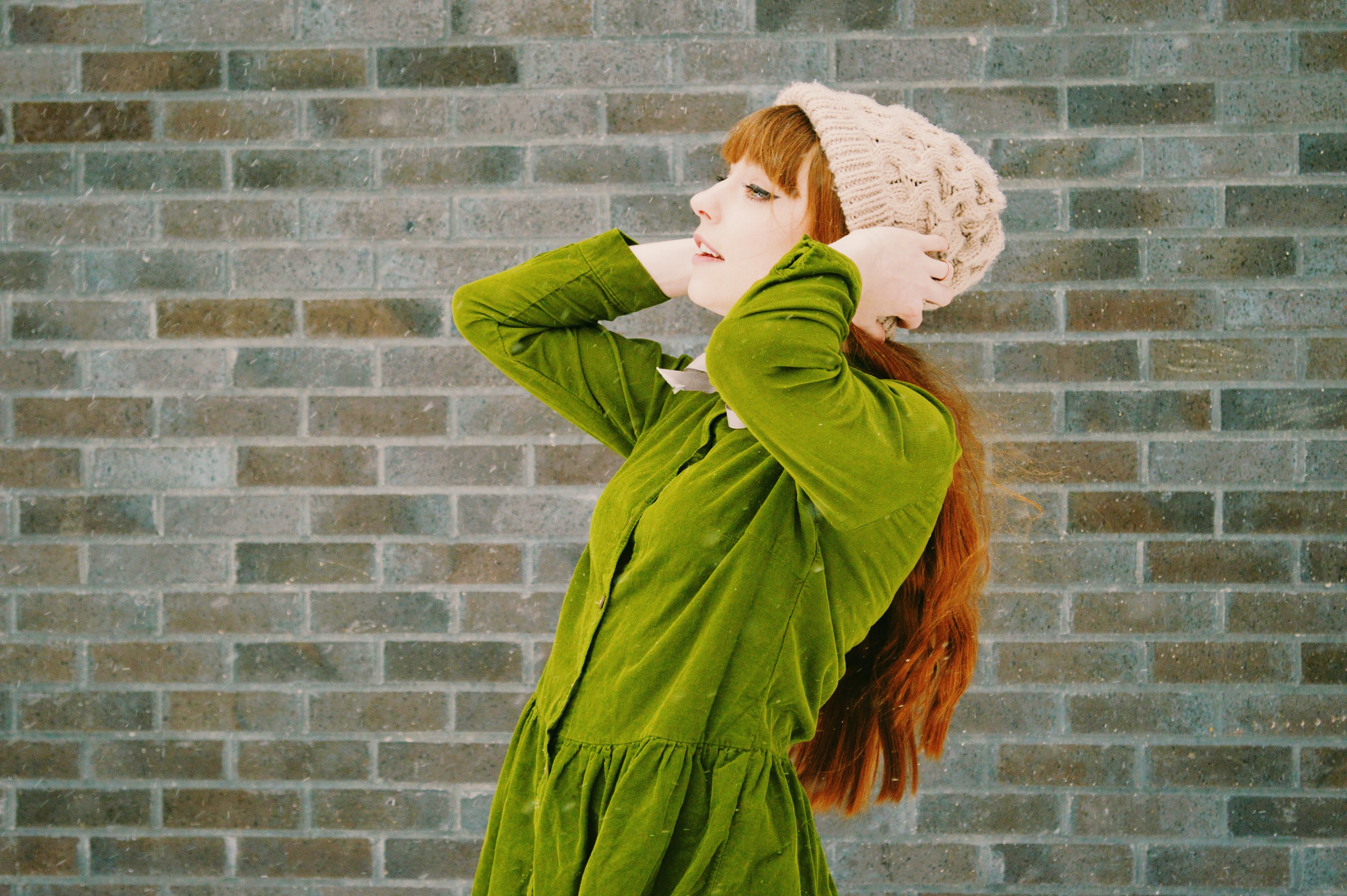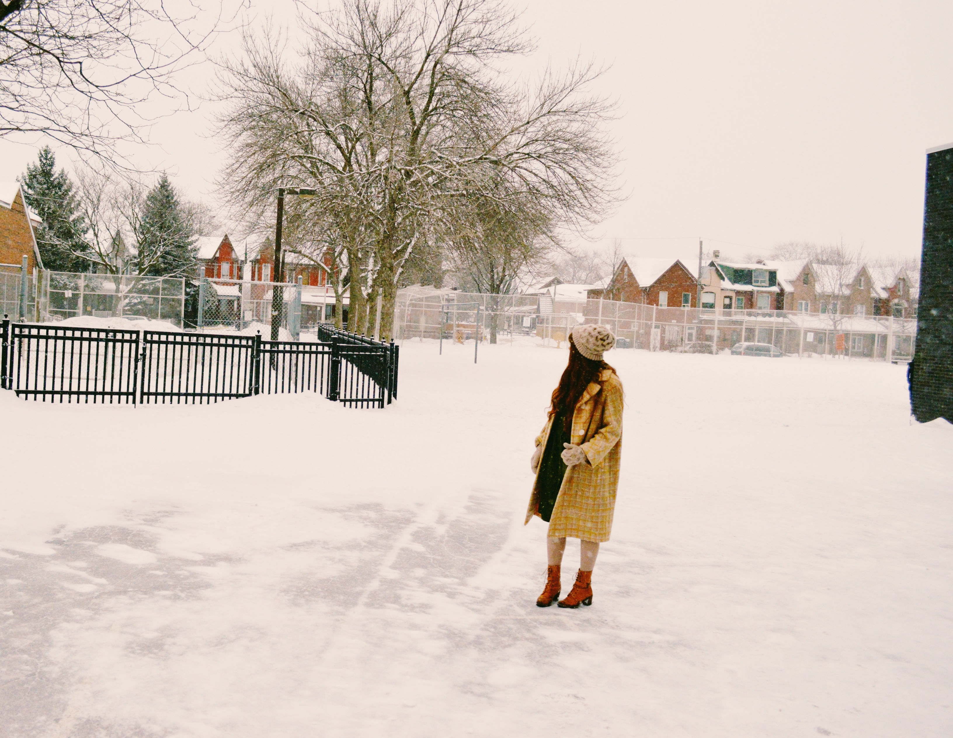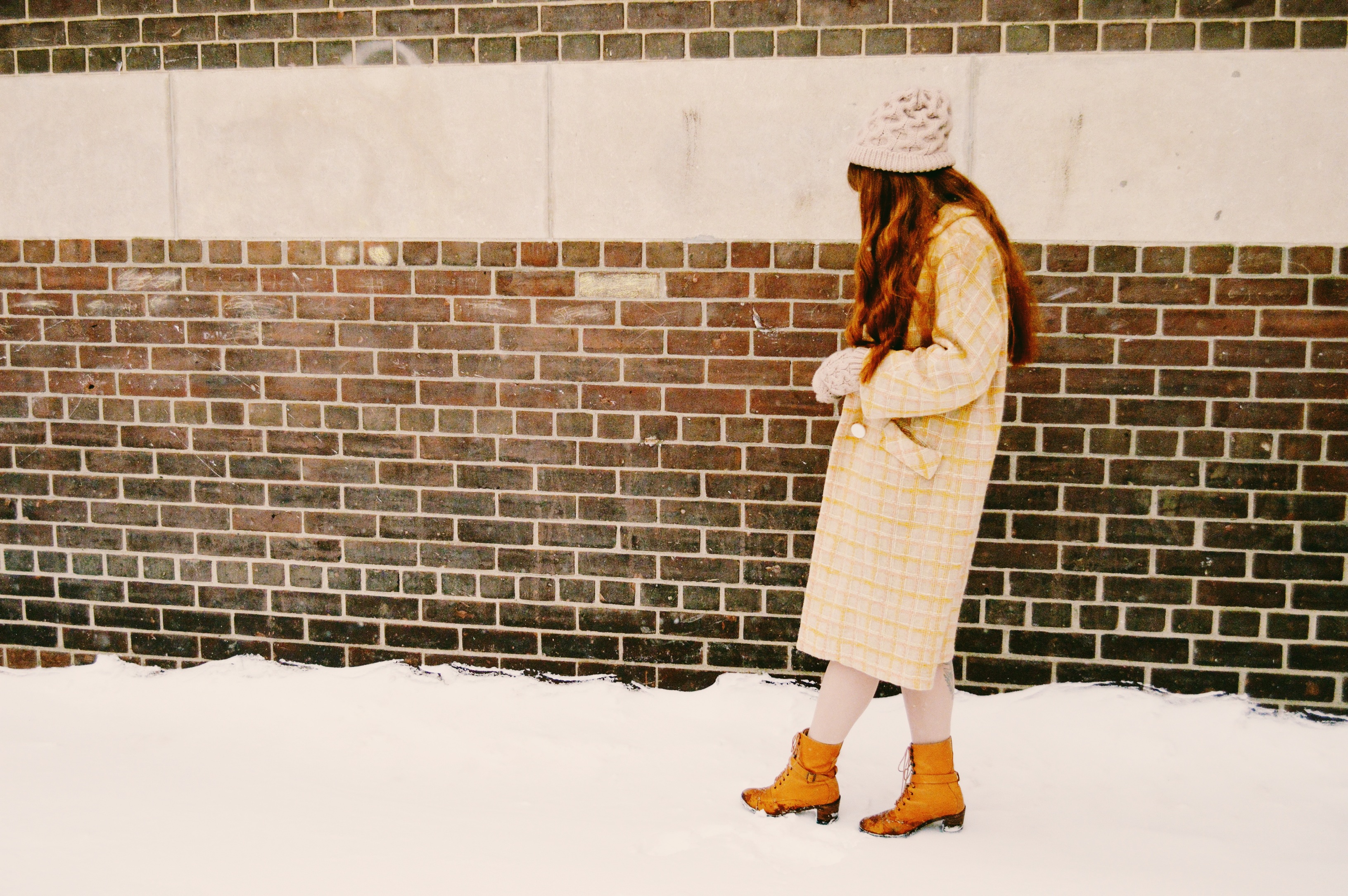Lately It’s been cold…real cold, and snowy, which is fairly normal when you live in Toronto, but that doesn’t mean I’ve ever fully gotten used to it or have any desire to spend time embracing it. On the weekend I was supposed to be styling a shoot with Gerald in Brantford, but the morning of the roads were just too dangerous to drive on. I had to admit defeat and accept that styling a shoot was just not worth the possibility of a car accident (I’ve been in several car accidents, which is probably why I have never learned to drive myself…ya, I’m 26 and I can’t drive). I spent the majority of the weekend in doors watching Netflix, eating tasty things and cuddling the dogs. However, Ryan and I did venture out Sunday afternoon to shoot these photos. While the winter may be cold, and I don’t much care for snow, it does make for really pretty pictures, and I thought my new dress would look perfect against an almost all white background. I don’t own many shapeless, drop-waist dresses like this. My person is quite small, so I find really boxy silhouettes to be a bit too much for me – I just sort of drown in them. But I love this dress. It’s so comfortable and it’s the perfect item to wear if you just want to lounge around. I liken it to a nightgown of sorts, which obviously pleases me. And this coat, oh this coat! I love this coat! It’s hard to tell, but the tartan on it is in mustard, white and blush pink, and the inner lining is a beautiful blush satin. It’s a bit oversized for me and thus looks strange buttoned up, but I had to have it just based on the colour scheme. So here we are, stepping out of my comfort zone and embracing the shapeless life.